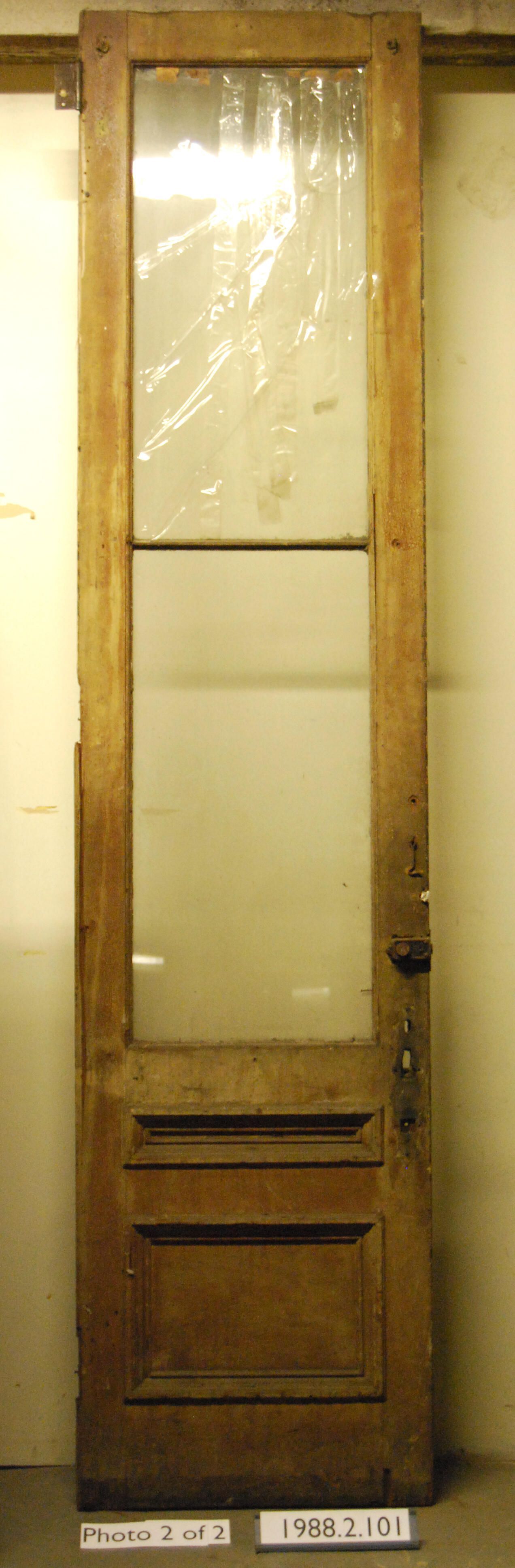 Exterior door. Exterior has 2 panels, one with complex applied molding with four square pyramidal ornaments around lower panel. Upper panel has central rosette with flanking moulding. Has two openings -- lower is complete glass pane -- upper is broken & taped with clear cellophane tape. hardware: One replacement hinge. Other two missing. Later cylinder lock and hook. All other hardware including mortise lock is missing. Style has section missing. Painted.
