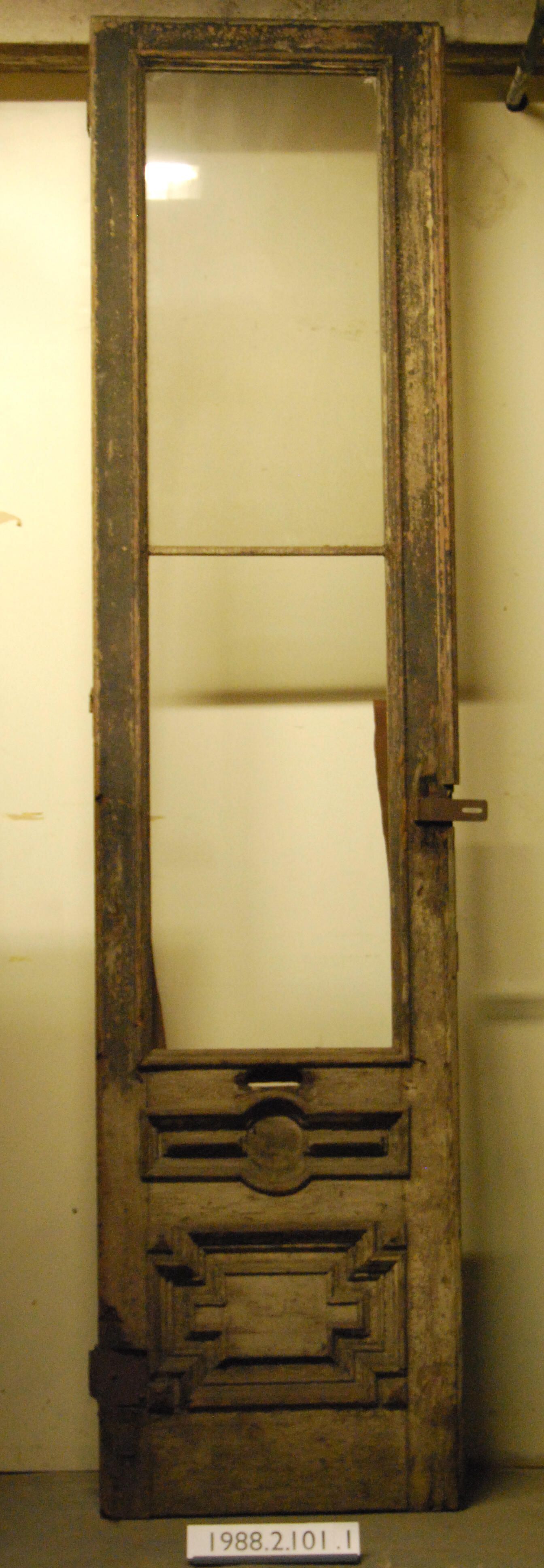 Exterior door. Exterior has 2 panels with complex applied mouldings with 4 square pyramidal ornaments around lower panel. Upper panel missing center rosette. Has two openings -- upper clear glass pane intact -- lower pane missing. Hardware: One complete cast iron handle; one broken cast iron hinge leaf; and one later replacement hinge. Later hasp and later lock strike plate and original lock strike plate. Interior has sliding bolt and original sliding bolts. Interior has two panels with applied moulding. Top section of astragal moulding intact - lower half missing. Both sides are painted brown.