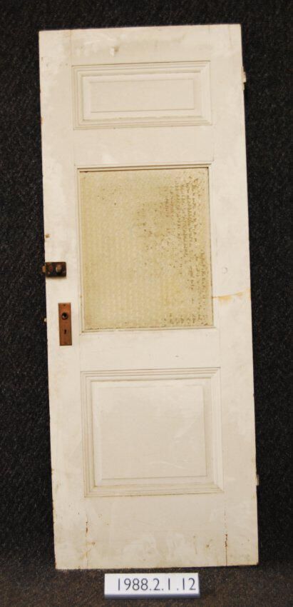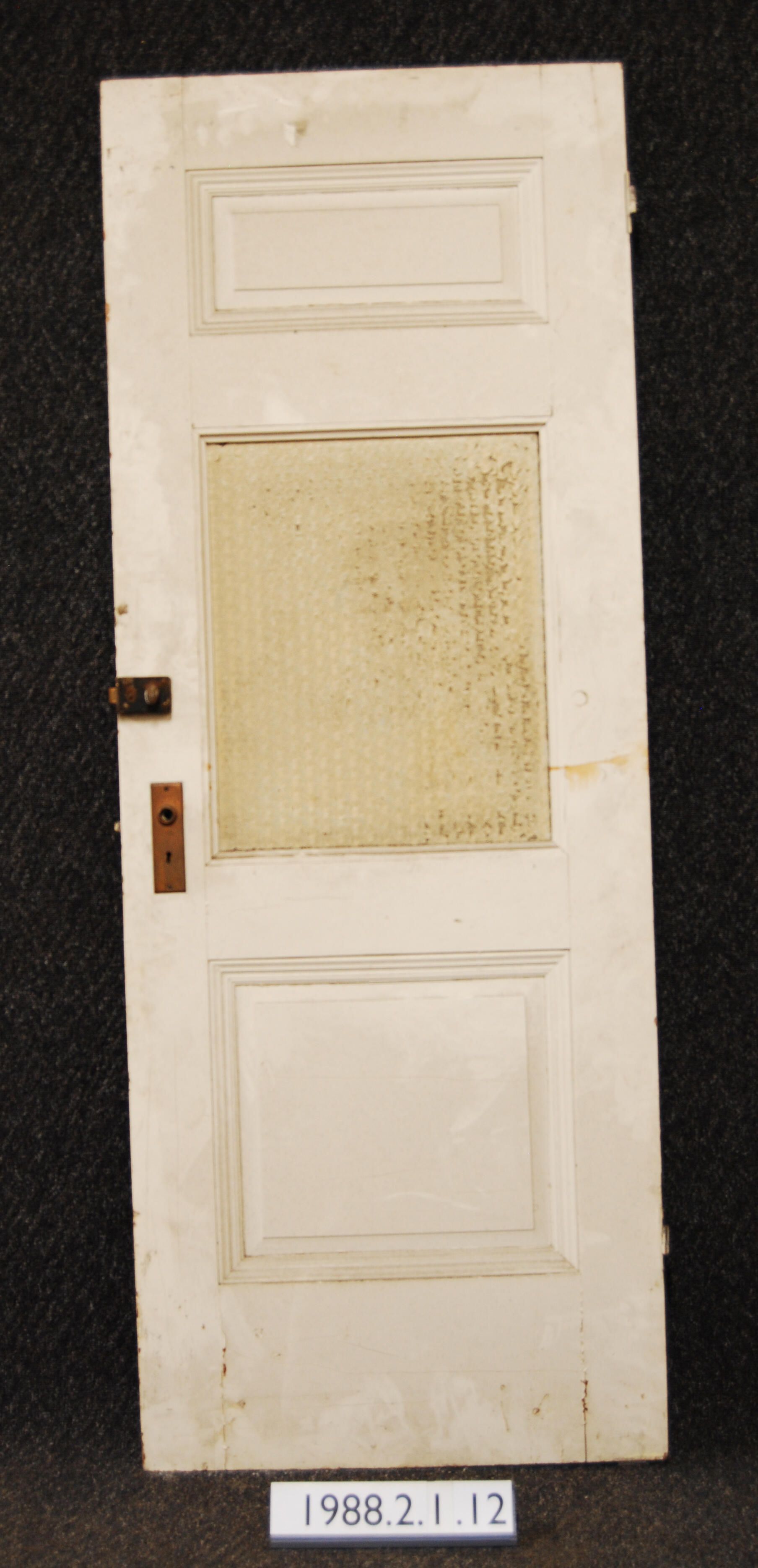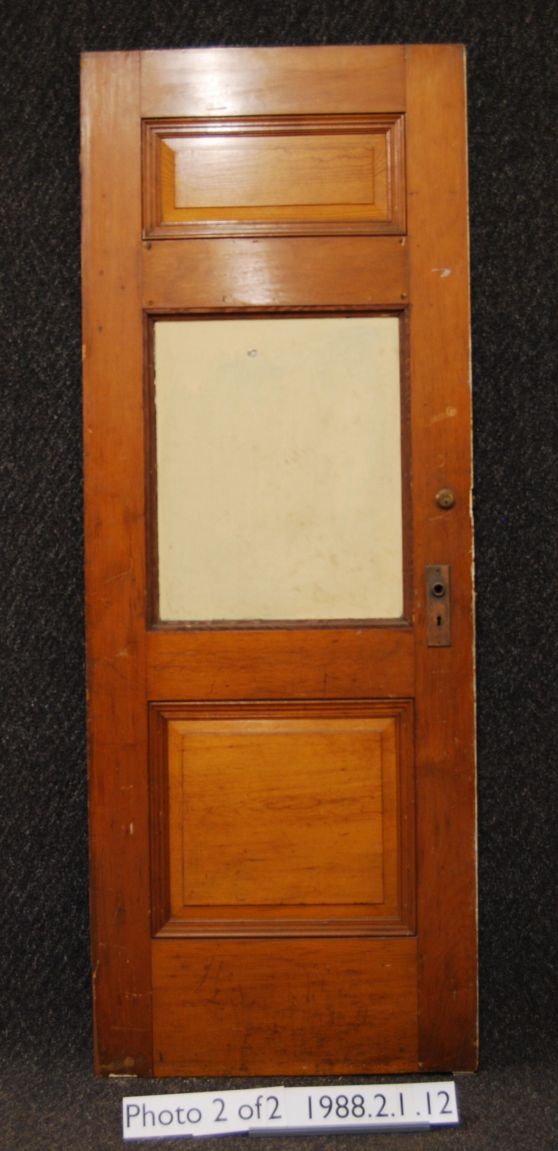 Interior door. Two panels with applied moldings. Single opening with colorless molded pattern glass. Has two hinge leaves. Mortice lock and escutcheon plates. Has early, if not original, cylinder lock. One side is varnished and the other side is painted cream.