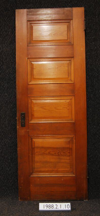 Interior door. Four panels with applied moldings. Has mortice lock. escutcheon plates. Two hinges. Door is varnished on both sides. Inscriptions or Markings: Manufacturer: Place of Manufacturer: Design Motif: Style: Finish: Varnished
