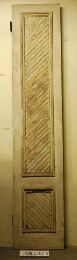 Exterior door. Modern reproduction of historic Victorian style. Two panel with diagonal beaded board infill. Applied moldings. Has three historic cast iron hinges. Has two vertical spring bolts and modern lock strike plate. Door is painted cream colored on exterior side.
