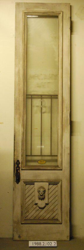 Exterior door. Modern reproduction of historical Victorian style. Single opening with clear colorless glass pane. Single panel with diagonal beaded boards backed with plywood. Applied moldings. Has historic lock strike plate. Bronze / brass female figure head of undetermined date applied to panel. Exterior side of door is painted white - Interior side is varnished. Inscriptions or Markings: Manufacturer: Place of Manufacturer: Design Motif: Style: Finish: Painted / Varnished
