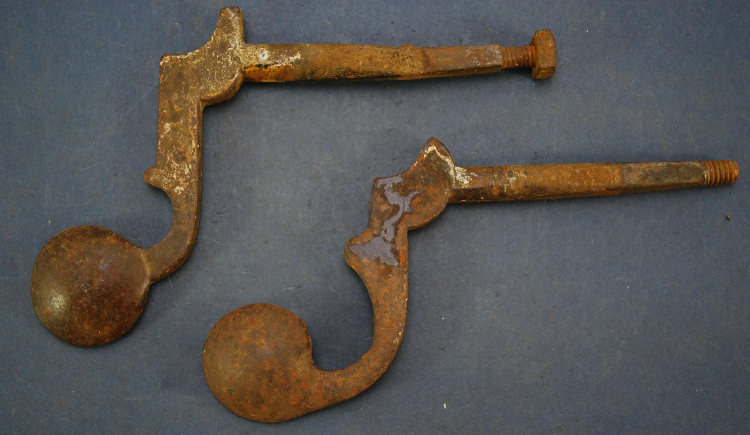 Design Name: Manufacturer: Unknown Style: Material: Iron Manufacturing Method: Forged Surface Finish: Aged / Unpolished VDA Classification: VDA Number: Shape: Patent Specifics: Lock Type (If Applicable): Inscription/Makers Mark: Inscription Text: Comments: Hand forged, handles for rim-type lock, probably not from same maker or origin. One slightly bent.