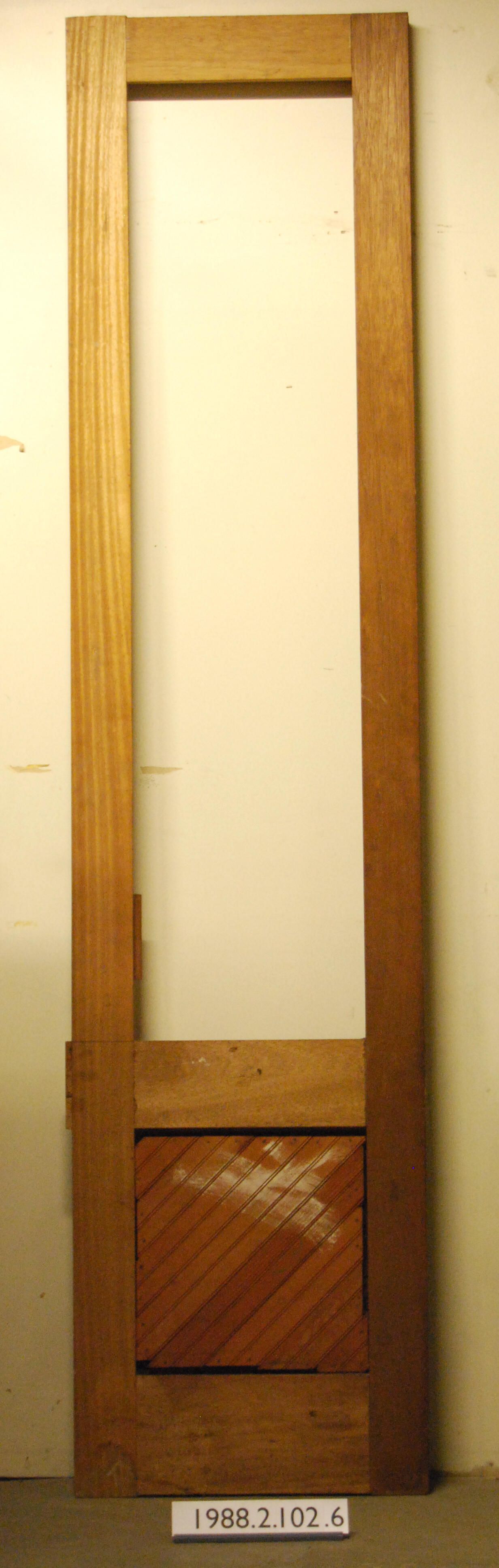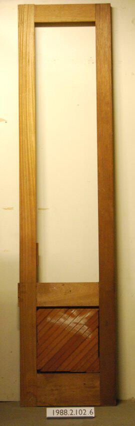 Exterior door. Reproduction of historical Victorian style. Single panel with diagonal beaded board infill. No moldings. Single opening. No glass. Preform door (unused). Unpainted. Inscriptions or Markings: Manufacturer: Place of Manufacturer: Design Motif: Style: Finish: Unpainted