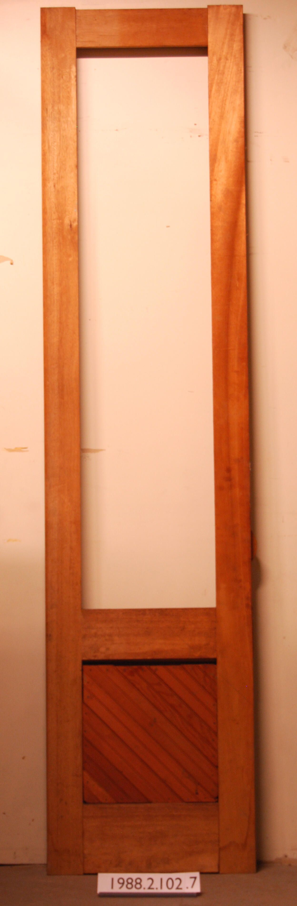Exterior door. Reproduction of historical Victorian style. Single panel with diagonal beaded board infill. No moldings. Single opening. No glass. Preform door (unused). Unpainted.