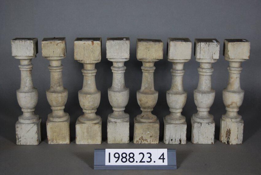 One lot of eight exterior wood balusters. Turned. Sand textured. Painted white. Inscriptions or Markings: Manufacturer: Place of Manufacturer: Design motif: Style: Finish: Painted