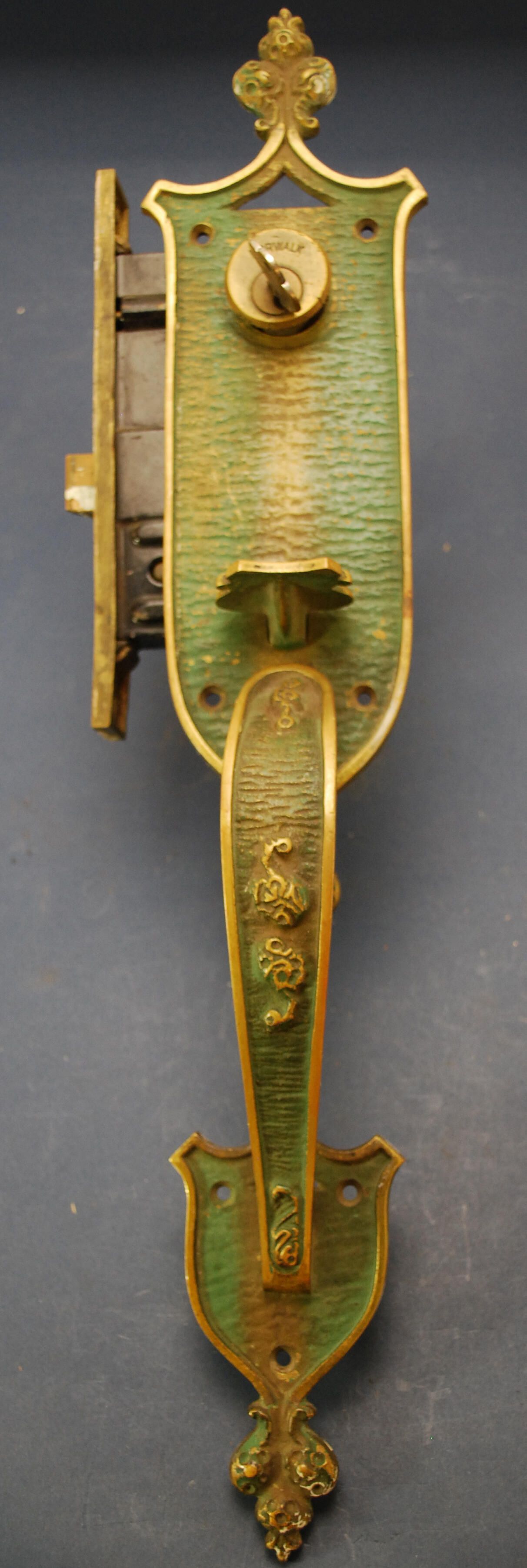 Comments: Mortise lock with Norwalk cylinder lock, modern key, thumb latch, escutcheon, and handle.