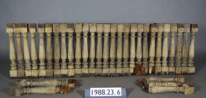 One lot of thirty-two exterior wood balusters. Turned. Painted beige. Of the total of thirty-two, four are truncated. Another nine are incomplete. Some have dry rot. (Thirteen of the total in poor condition).