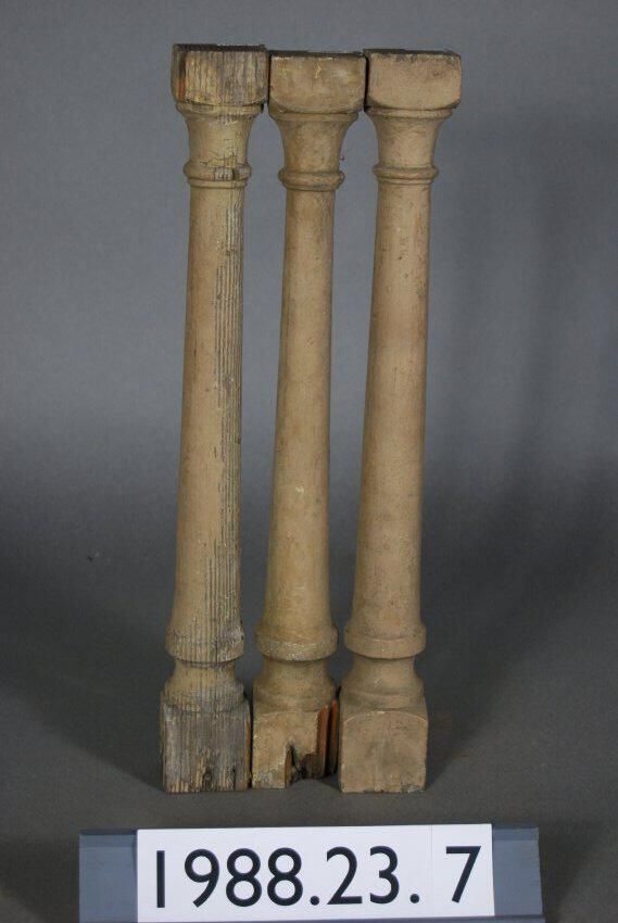 One lot of three exterior wood balusters. Turned. Painted beige. One is damaged at bottom end. Inscriptions or Markings: Manufacturer: Place of Manufacturer: Design motif: Style: Finish: Painted