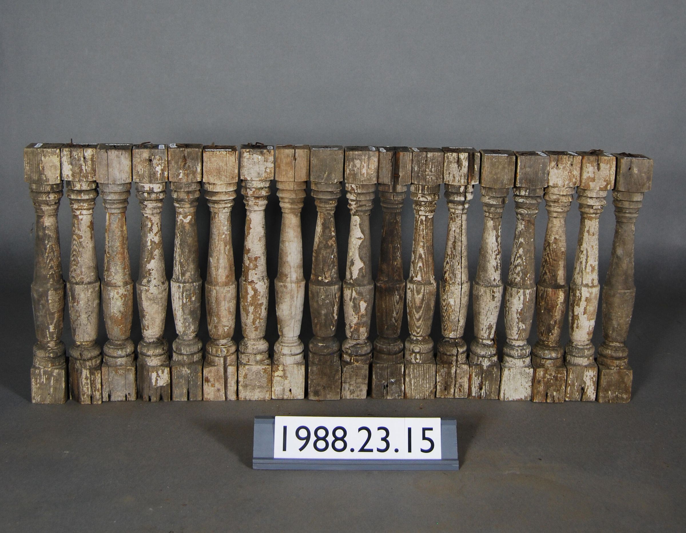 One lot of eighteen exterior wood balusters. Turned. Painted grey. Some with orange. All with peeling paint. Manufacturer: Place of Manufacturer: Design motif: Style: Finish: Painted