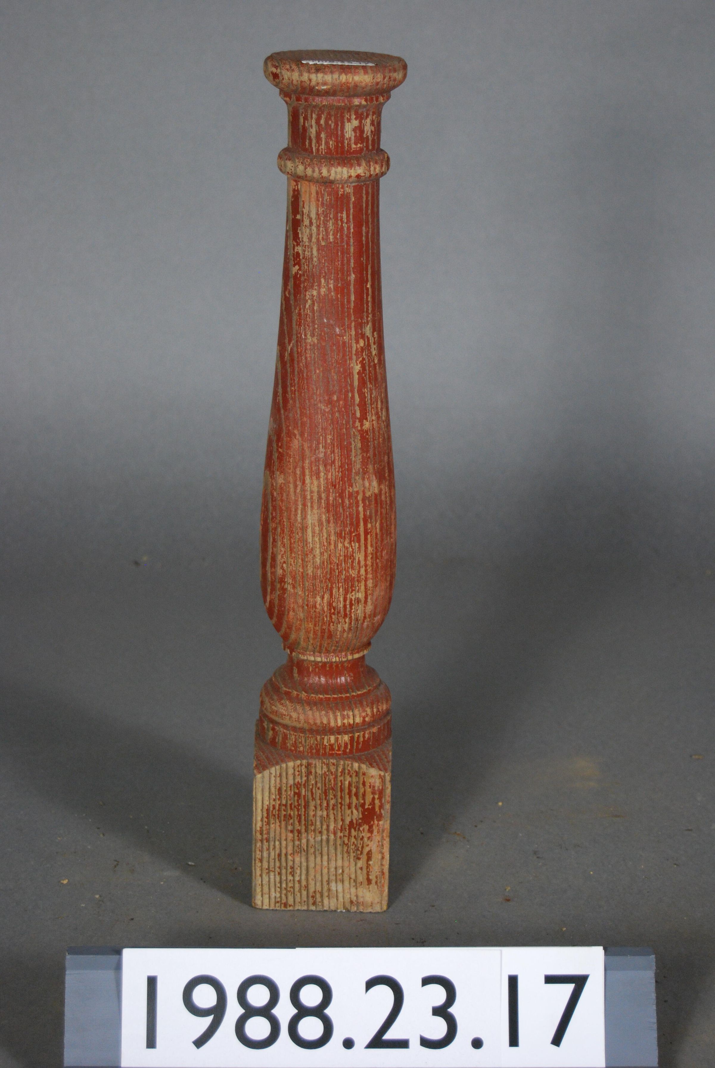 Exterior wood baluster. Turned. Painted reddish-brown. (Possibly modified by being shortened). Manufacturer: Place of Manufacturer: Design motif: Style: Finish: Painted