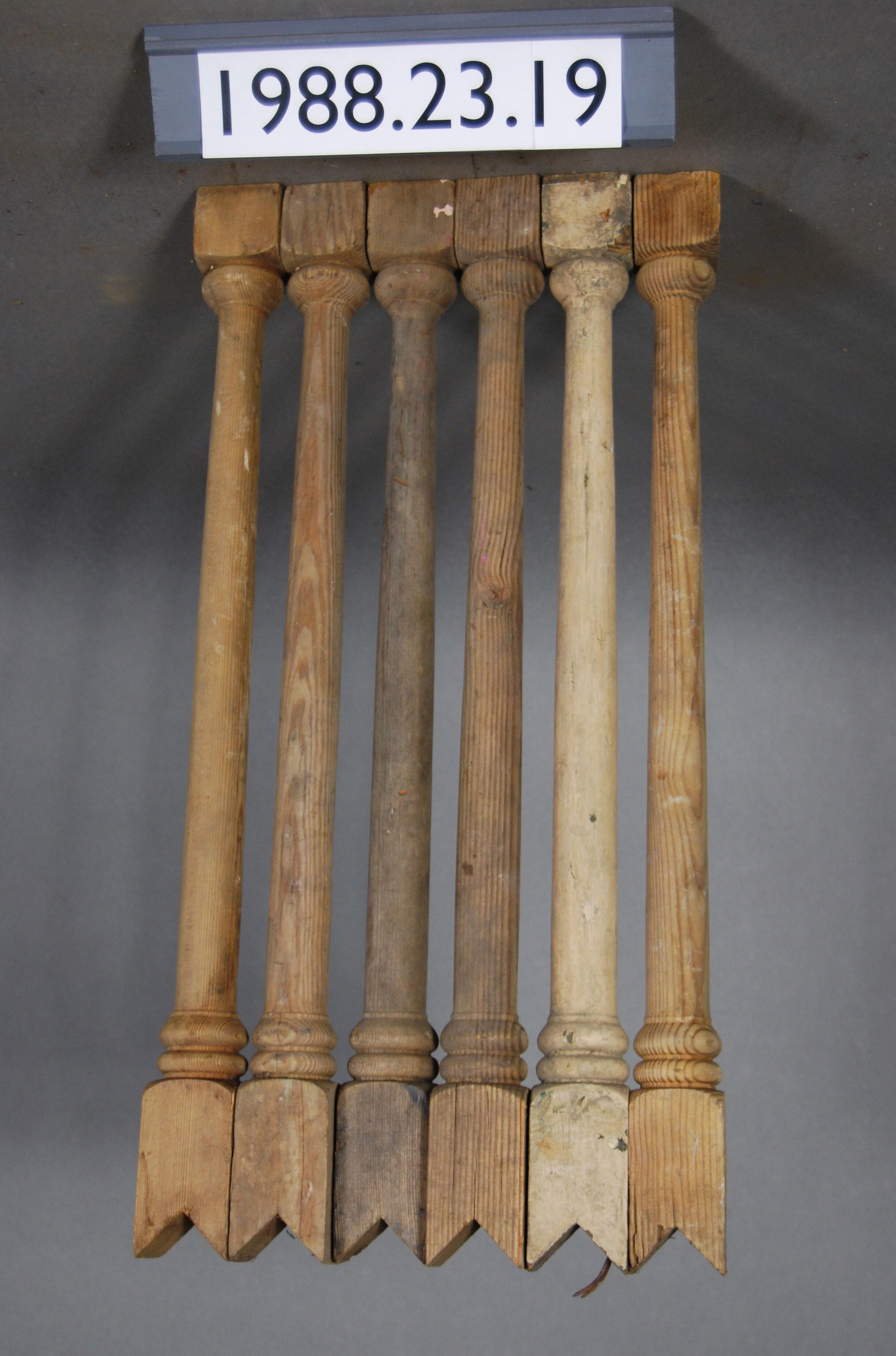 One lot of six exterior wood balusters. Turned. Each base has V-cut notch. One baluster painted beige. The other five have been stripped. Manufacturer: Place of Manufacturer: Design motif: Style: Finish: Painted / Stripped