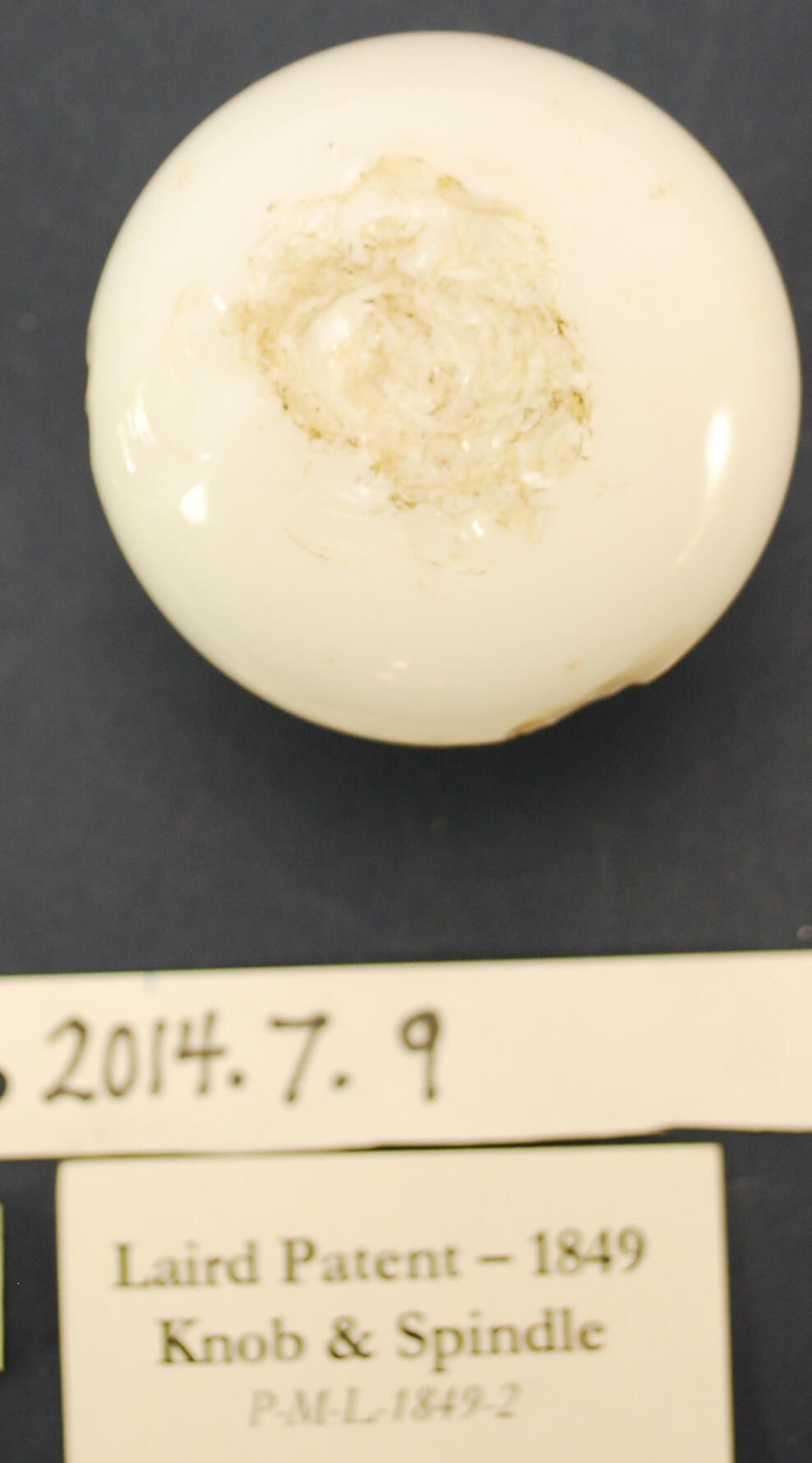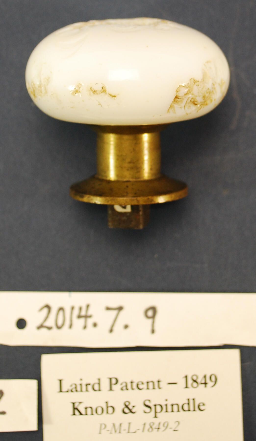 Design Name: Manufacturer: Unknown Style: Material: Glass / Ferrous / Brass Manufacturing Method: Surface Finish: VDA Classification: VDA Number: Shape: Patent Specifics: Laird Patent Lock Type (If Applicable): Inscription/Makers Mark: Inscription Text: Comments: Glass knob chipped / damaged, spindle has brass sleeve.