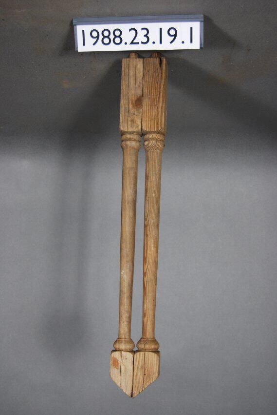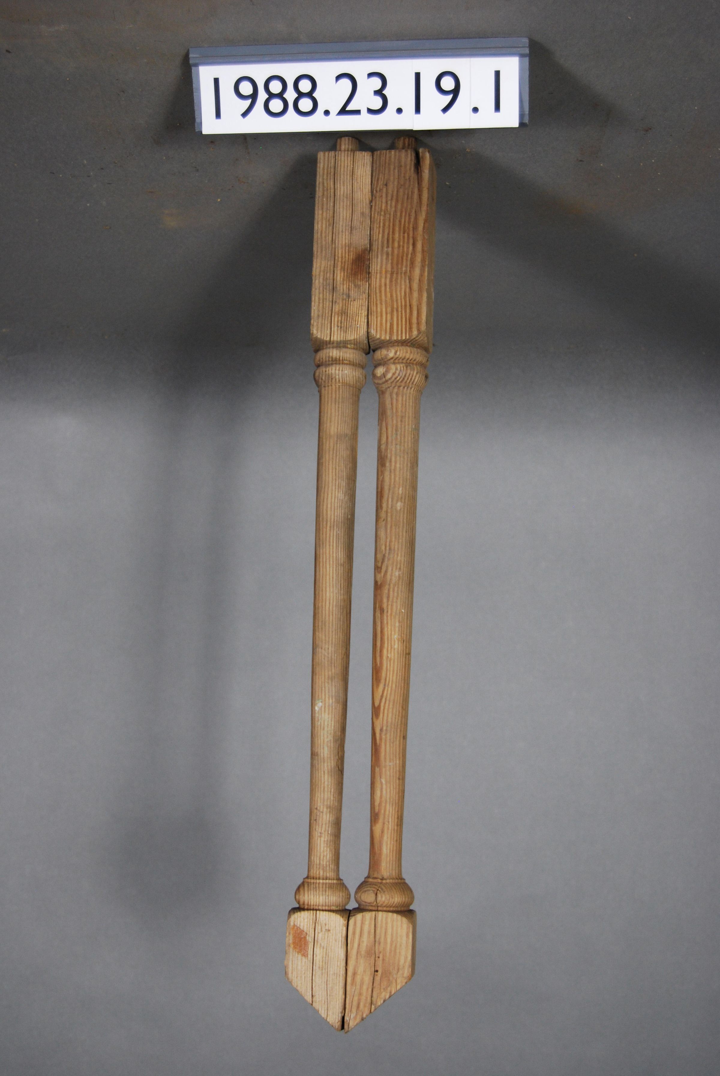 One lot of two exterior wood balusters. Turned. Each has cylindrical tenon. Top of each baluster is cut at 45 degree angle. Stripped of paint. Manufacturer: Place of Manufacturer: Design motif: Style: Finish: Stripped