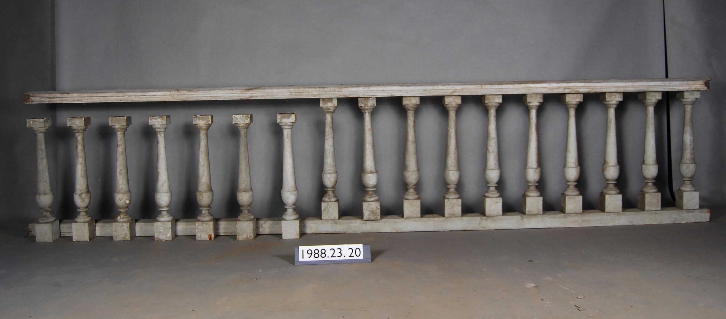 Exterior wood balustrade composed of seventeen turned balusters. Top rail with compound molded cross-section, and bottom rail. Eight balusters are detached. Painted grey. Manufacturer: Place of Manufacturer: Design motif: Style: Finish: Painted