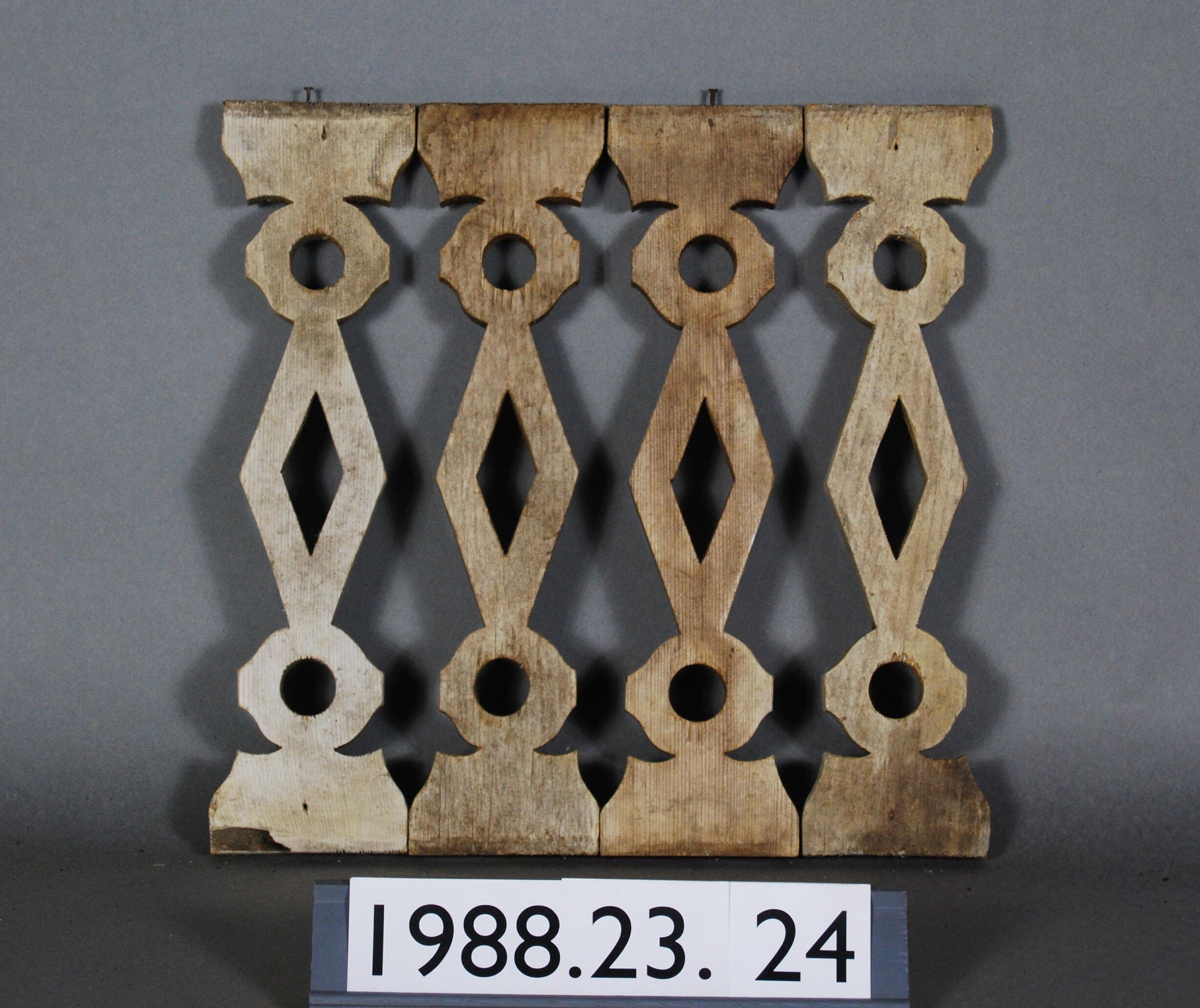One lot of six exterior wood balusters. Fret-work ornament cut from flat board. Stripped of paint. note:two additional balusters found and added to total in 2010. Manufacturer: Place of Manufacturer: Design motif: Style: Finish: Painted