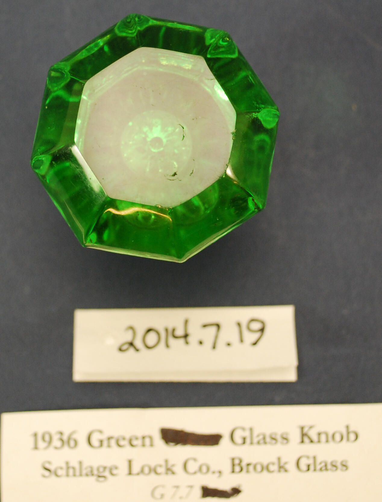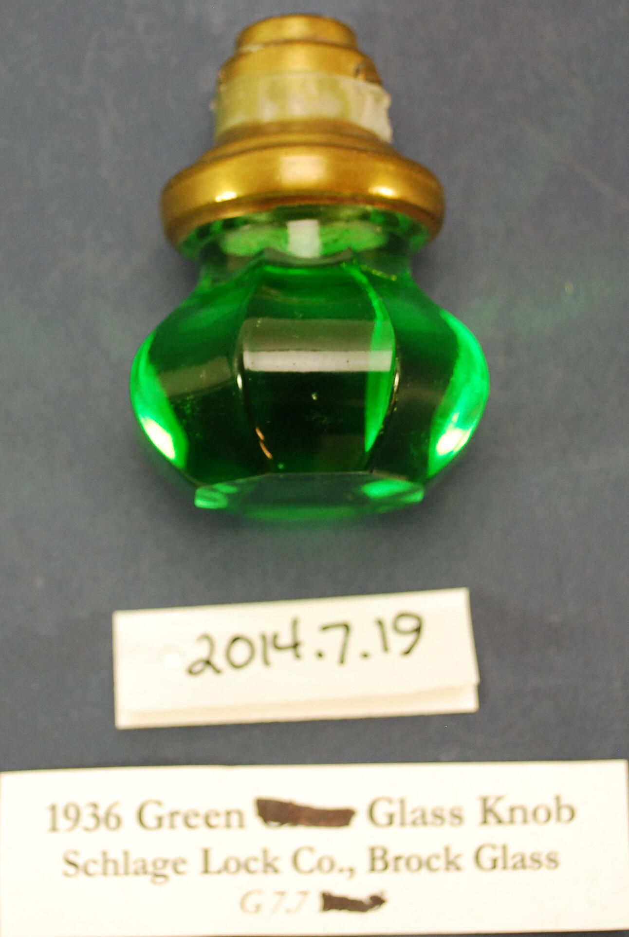 Design Name: Manufacturer: Attrib to Brock Glass / Schlage Lock Co. Style: Material: Glass / Brass Manufacturing Method: Pressed / Polished top Surface Finish: VDA Classification: Glass VDA Number: Z Shape: Octagonal Patent Specifics: Lock Type (If Applicable): Inscription/Makers Mark: Inscription Text: Comments: Green glass.