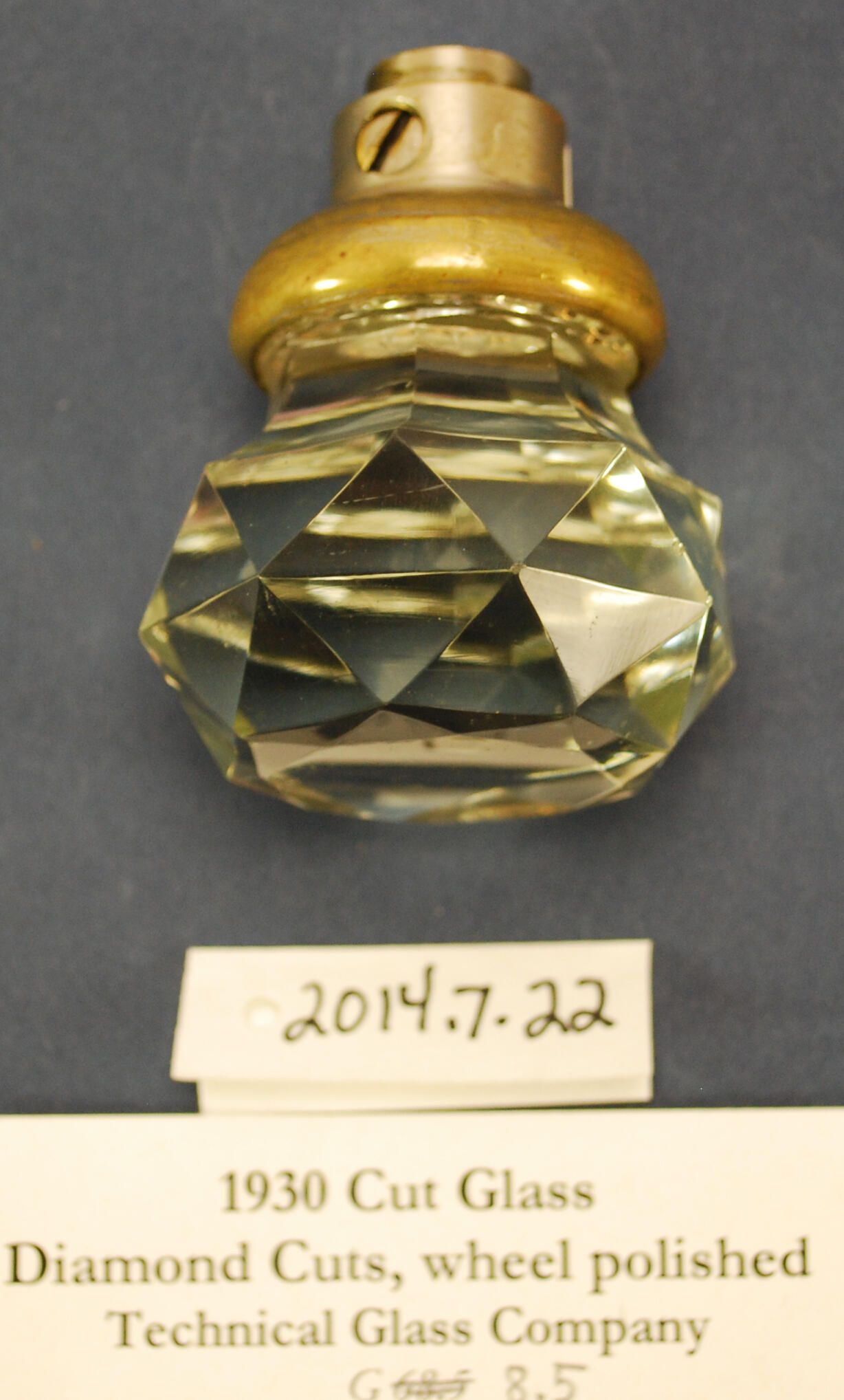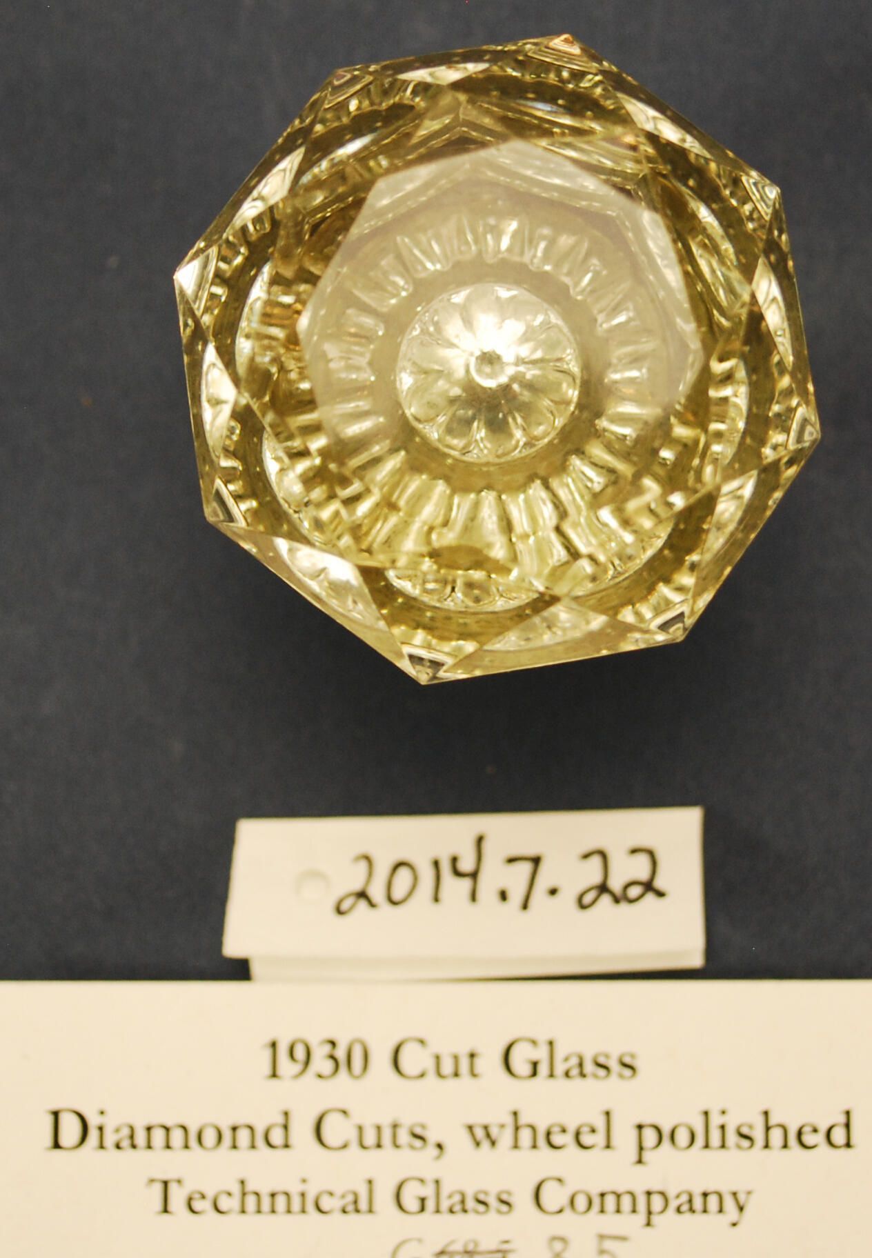 Design Name: Manufacturer: Technical Glass Co. Style: Material: Glass / Brass Manufacturing Method: Pressed / Cut Surface Finish: Plated, nickel VDA Classification: Glass VDA Number: Z Shape: Octagonal / Faceted Patent Specifics: Lock Type (If Applicable): Inscription/Makers Mark: Inscription Text: Comments: "Teggo" ?