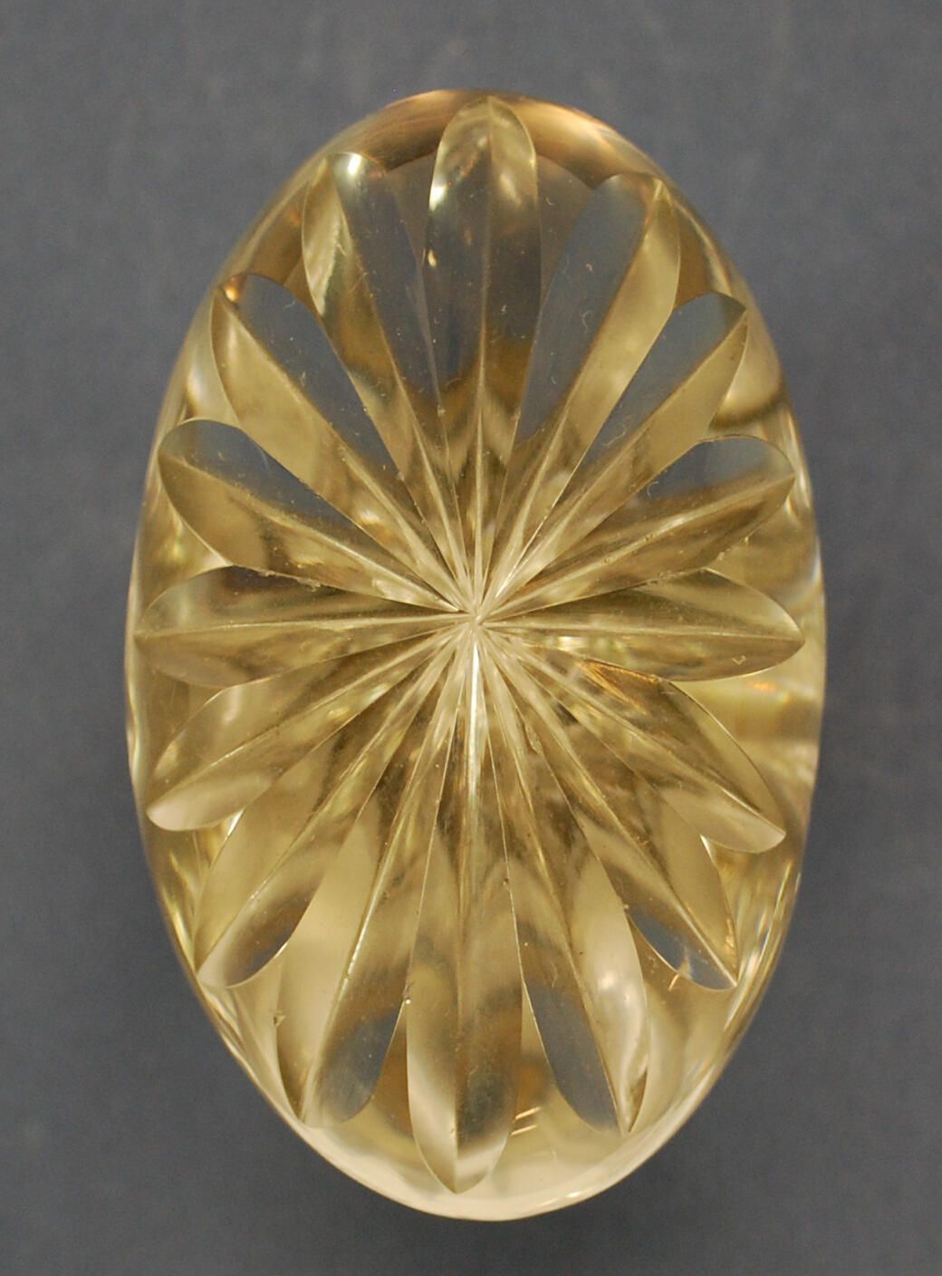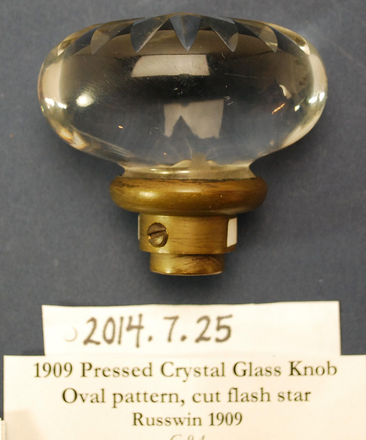 Design Name: Manufacturer: Attrib to Russell & Erwin Mfg. Co. Style: Material: Glass / Brass Manufacturing Method: Pressed / Wheel Cut Surface Finish: VDA Classification: Glass VDA Number: Z Shape: Oval Patent Specifics: Lock Type (If Applicable): Inscription/Makers Mark: Inscription Text: Comments: Clear glass, wheel cut fluting.