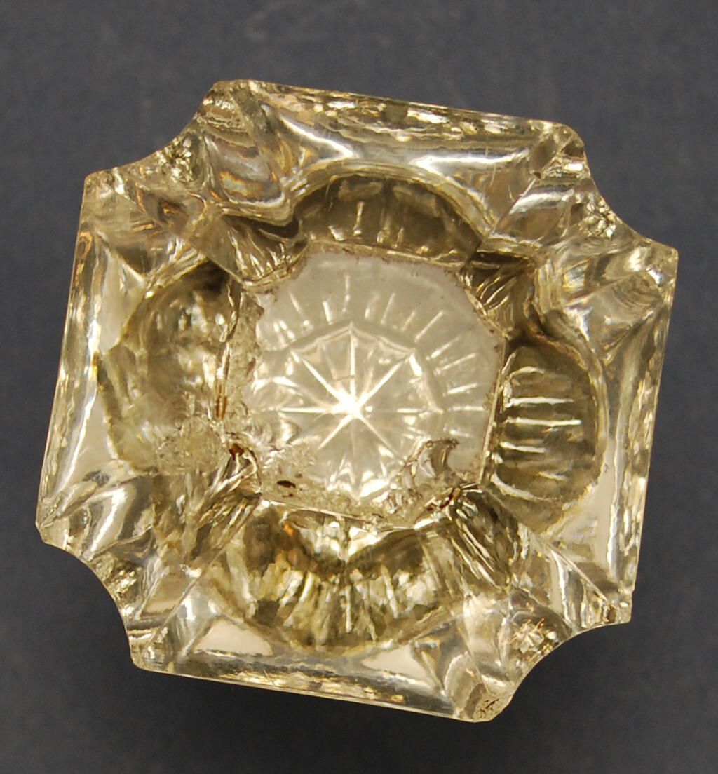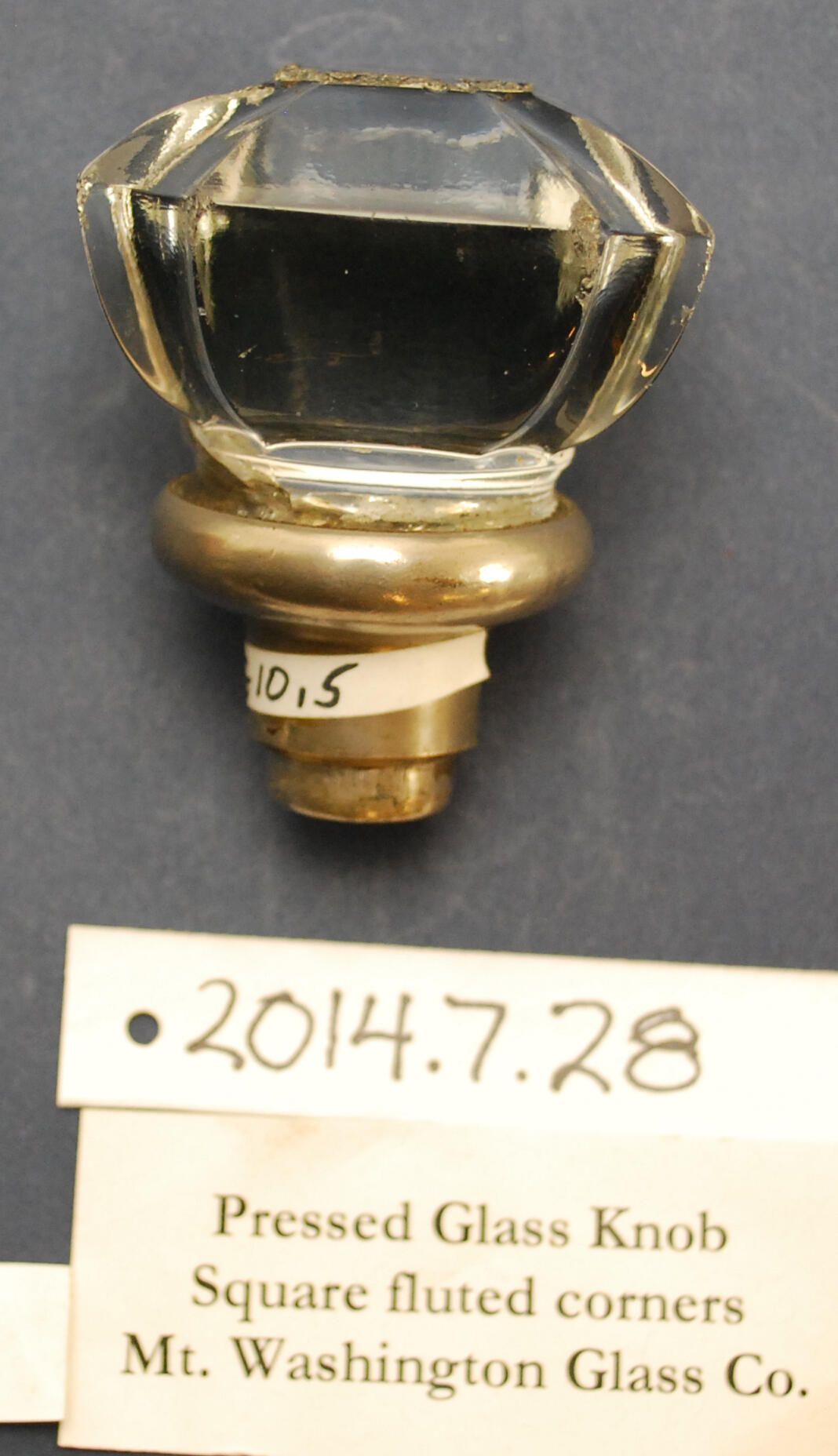 Design Name: Manufacturer: Mt. Washington Glass Co. Style: Material: Glass / Brass Manufacturing Method: Pressed / Polished front face Surface Finish: Plated, nickel VDA Classification: Glass VDA Number: Z Shape: Square / Fluted corners Patent Specifics: Lock Type (If Applicable): Inscription/Makers Mark: Inscription Text: Comments: Clear glass face is chipped.
