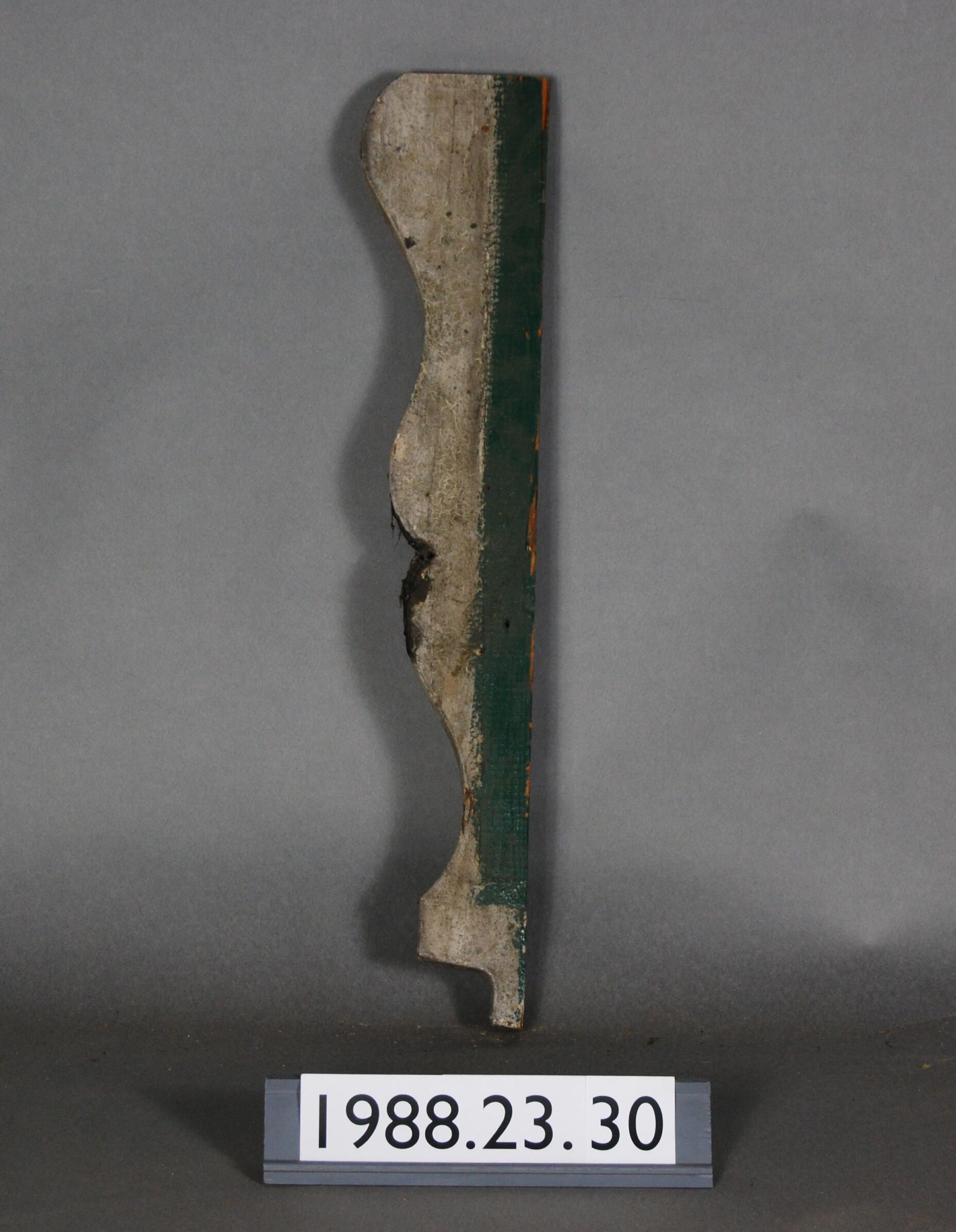 Exterior wood baluster. Compound contour at front edge. Straight on back edge. One end is truncated by saw cut. Painted grey with later green. Remnant of roofing tar on surface.
