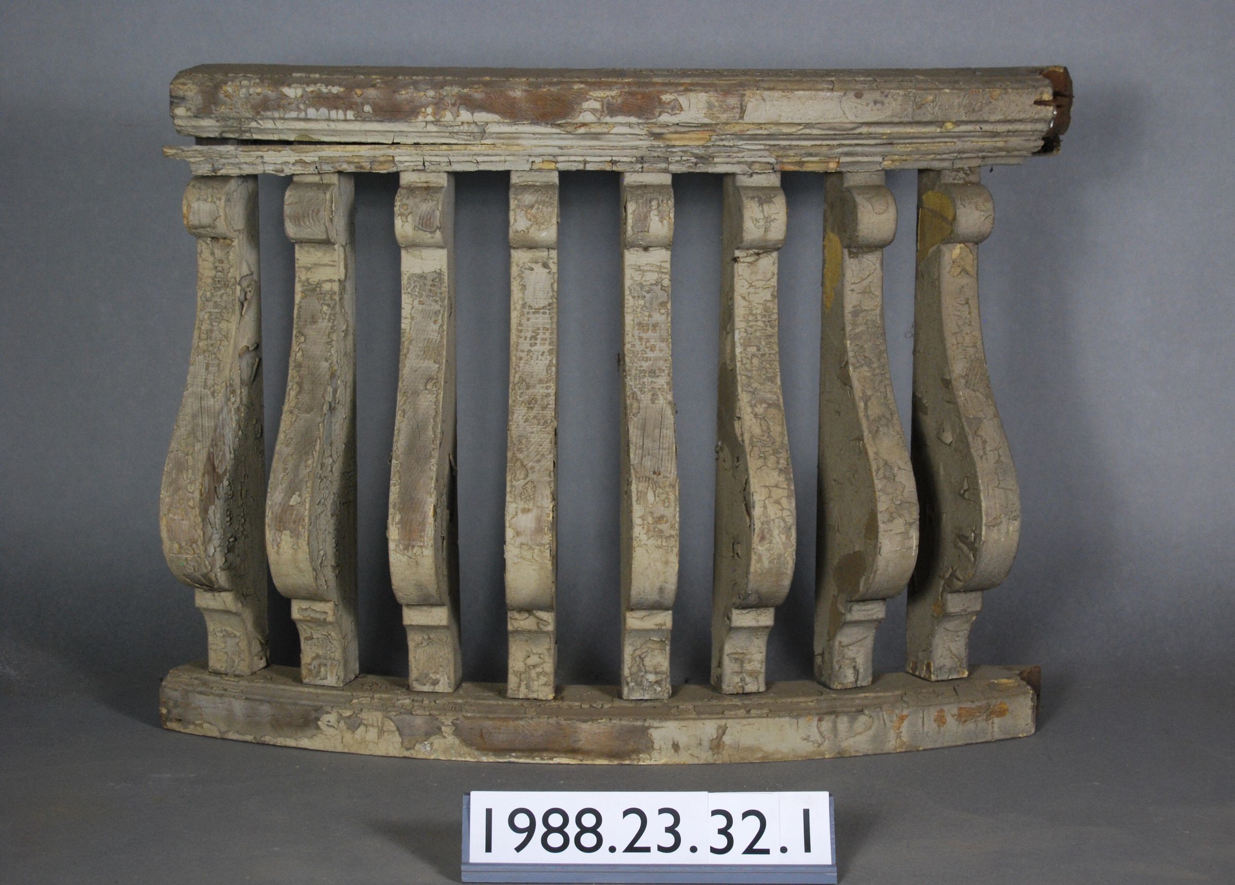 Exterior wood balustrade. Composed of eight balusters. Curved top rail with applied moldings. Carved bottom rail. Painted beige. See 1988.23.32. Manufacturer: Place of Manufacturer: Design motif: Style: Finish: Painted