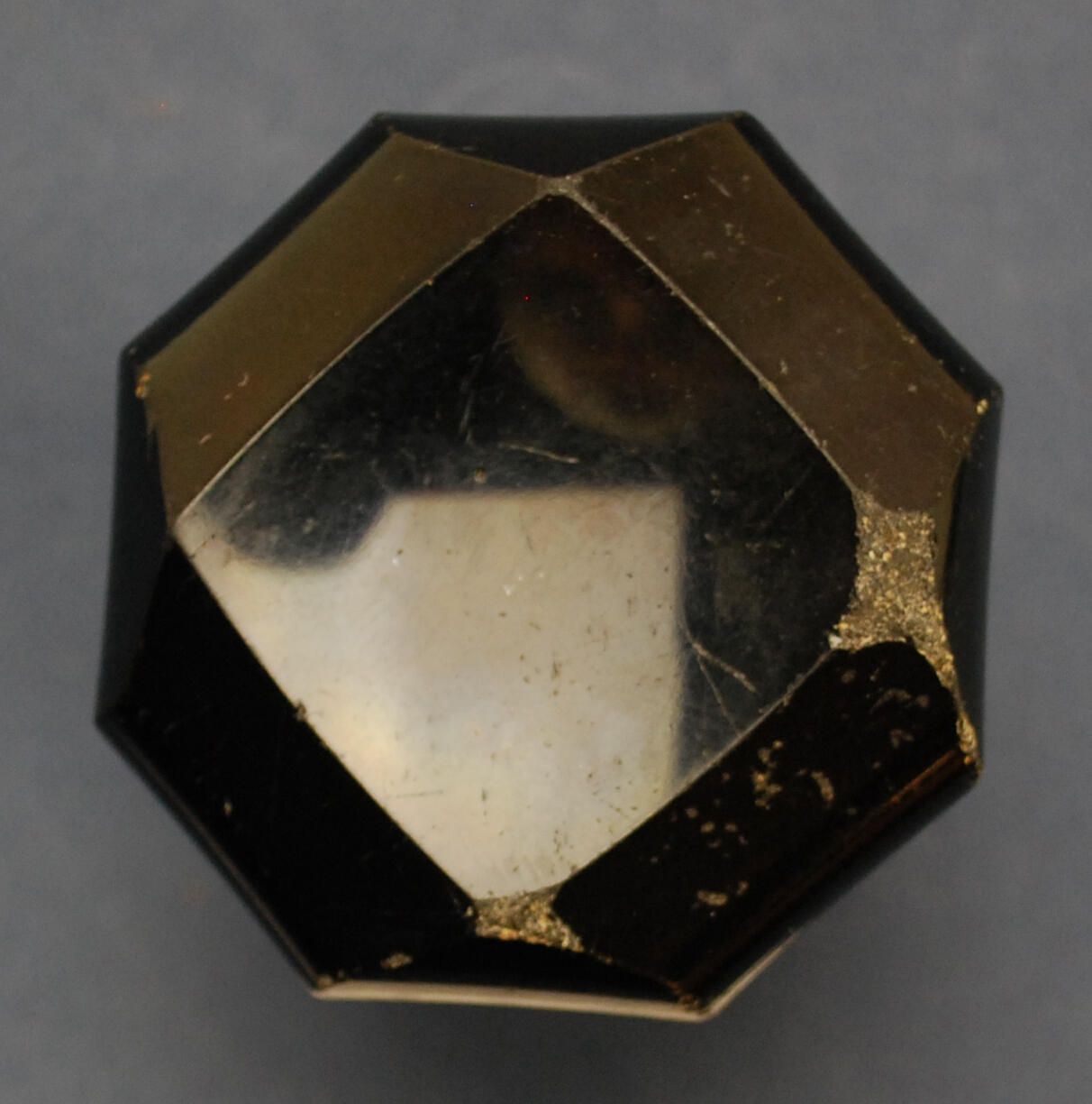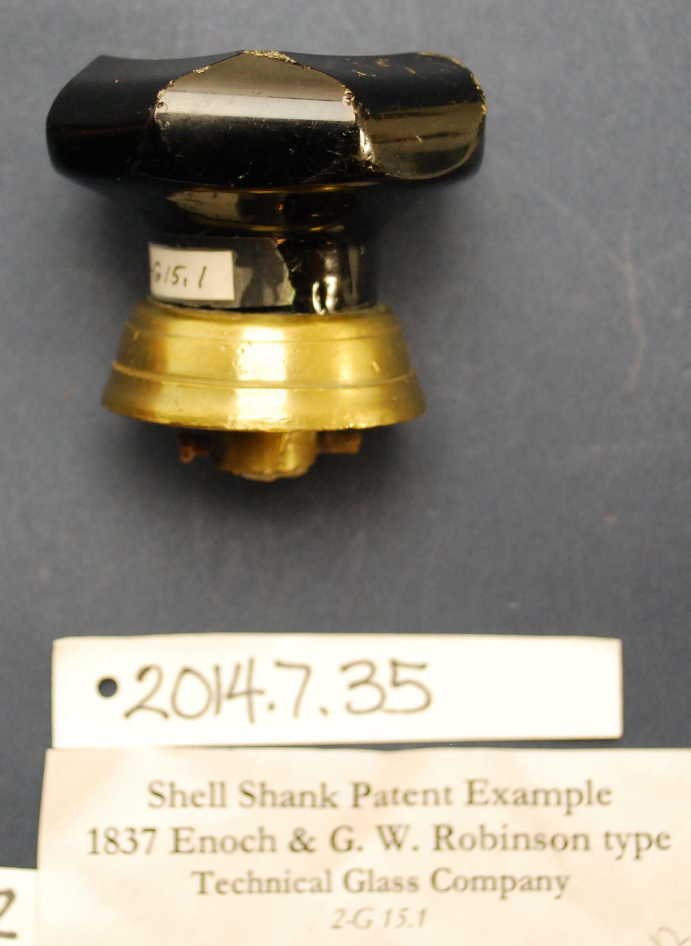 Design Name: Manufacturer: Technical Glass Co. Style: Material: Glass / Brass Manufacturing Method: Cast Surface Finish: VDA Classification: Glass / Cut VDA Number: Z Shape: Octagonal Patent Specifics: 1837 Enoch + G. W. Robinson Patent 434 Lock Type (If Applicable): Inscription/Makers Mark: Inscription Text: Comments: Black opaque glass, shell shank patent example.