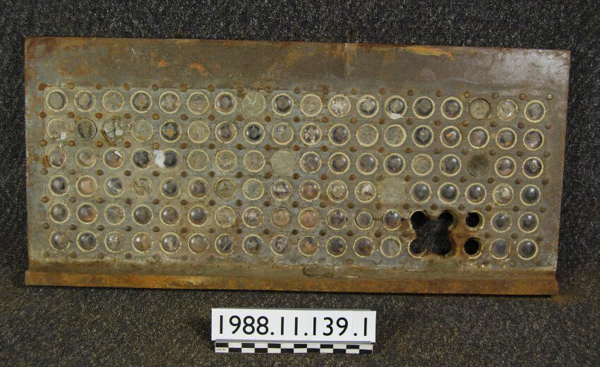 Cast iron vault light, rectangular plate with series of equi-distant holes fitted with cylindrical glass plugs, (to emit natural sunlight).Some glass plugs are missing. Flange on one edge.