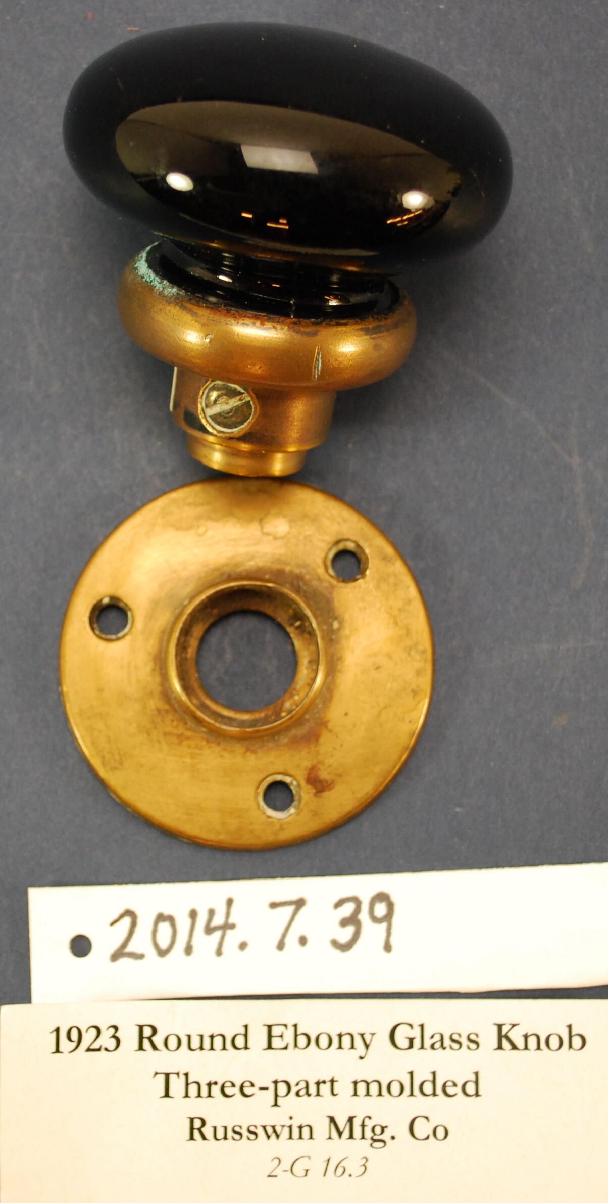 Design Name: Manufacturer: Attrib to Russell & Erwin Mfg. Co. Style: Material: Black Glass / Bronze Manufacturing Method: Pressed Surface Finish: VDA Classification: Glass VDA Number: Z Shape: Domed Patent Specifics: Lock Type (If Applicable): Inscription/Makers Mark: Inscription Text: Comments: Opaque black ebony glass with bronze rose.