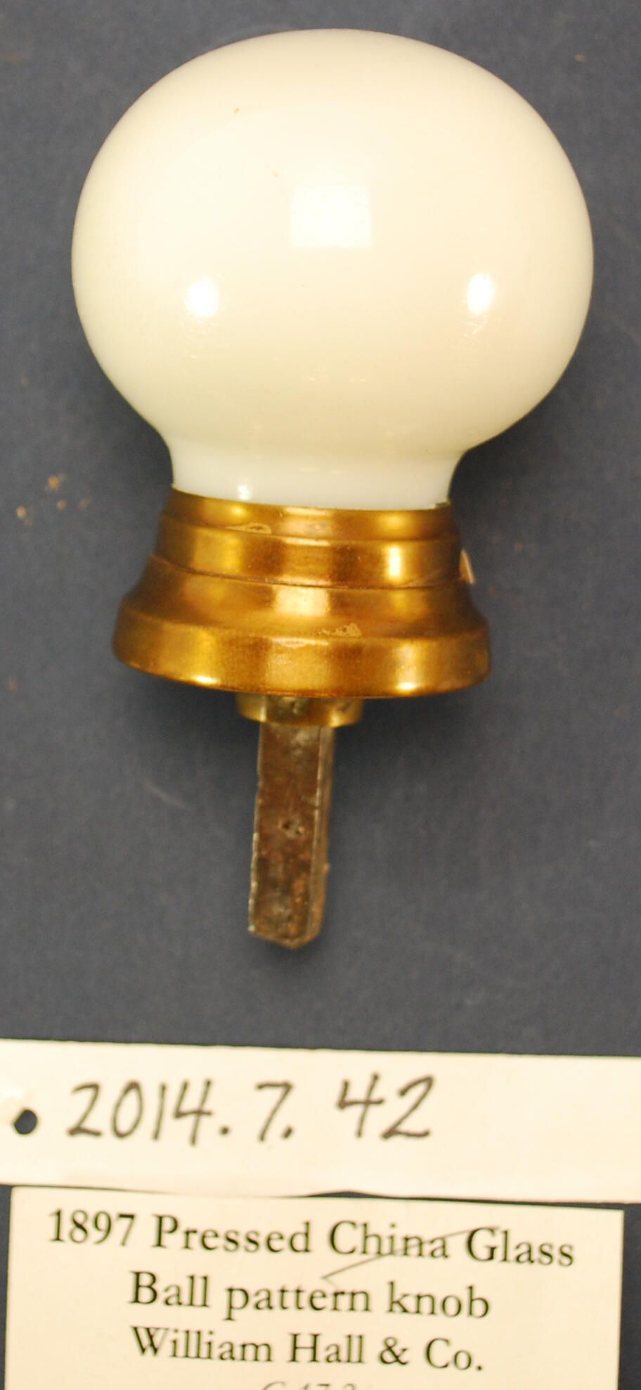 Design Name: Manufacturer: Attrib to William Hall & Co. Style: Material: Milk Glass / Bronze Manufacturing Method: Pressed / Cast Surface Finish: VDA Classification: Glass VDA Number: Z Shape: Spherical Patent Specifics: Lock Type (If Applicable): Inscription/Makers Mark: Inscription Text: Comments: Opaque white "China" glass. Fat footed shank.