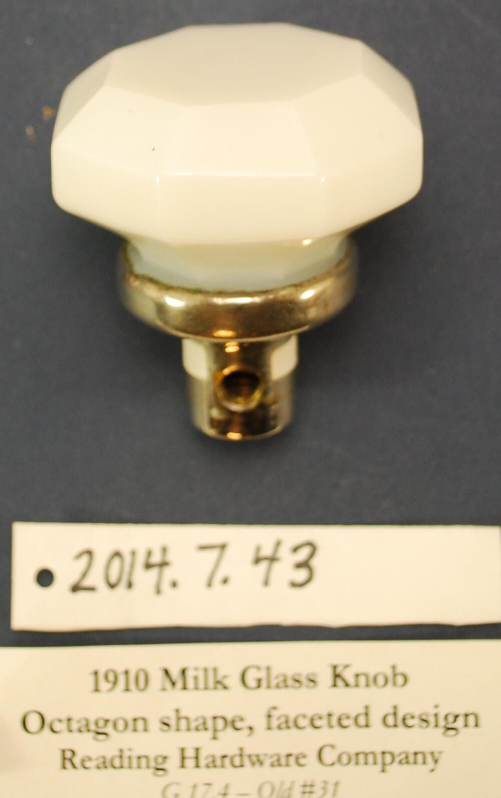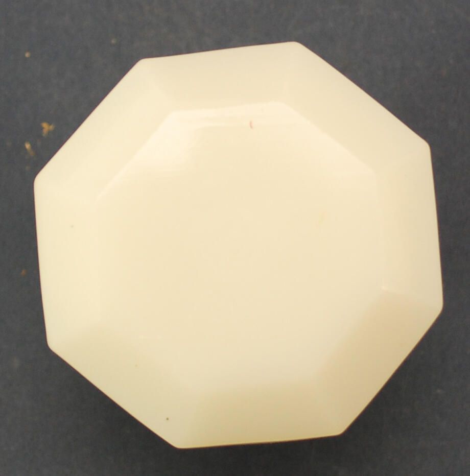Design Name: Manufacturer: Attrib to Reading Hardware Co. Style: Material: Opalescent Glass / Brass Manufacturing Method: Pressed / Polished Face Surface Finish: Plated, nickel VDA Classification: Glass VDA Number: Z Shape: Octagonal / Faceted Patent Specifics: Lock Type (If Applicable): Inscription/Makers Mark: Inscription Text: Comments: Opaque white milk glass.