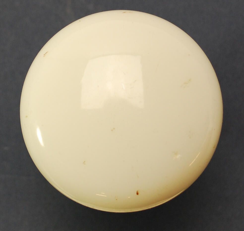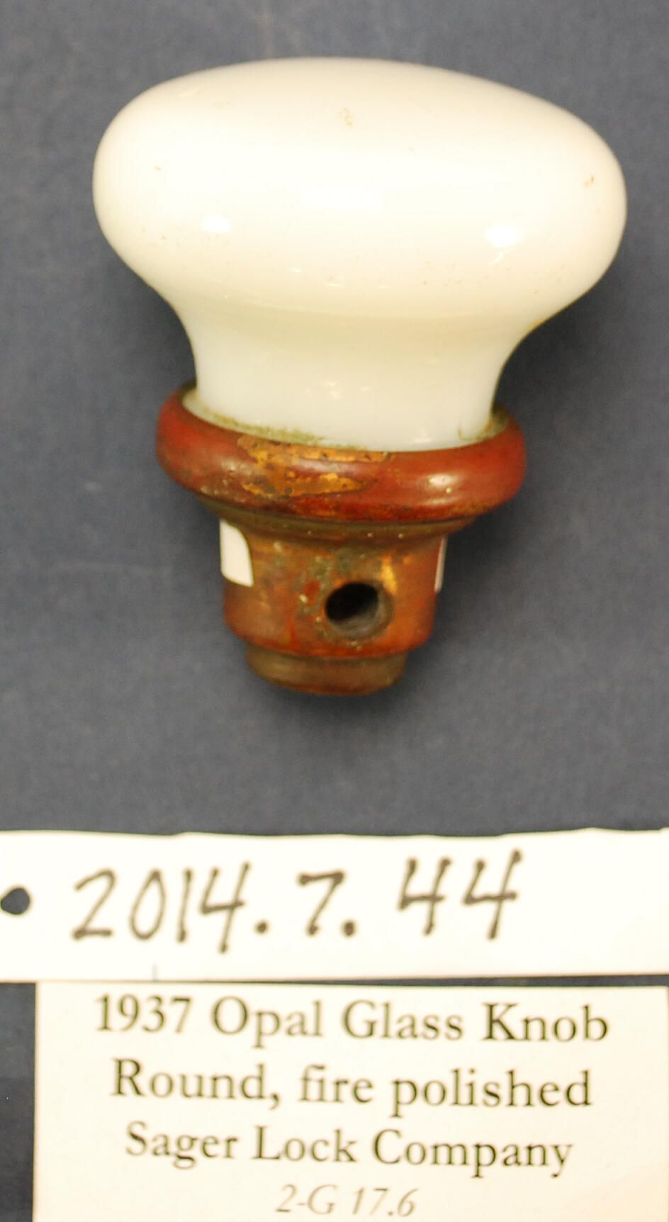 Design Name: Manufacturer: Attrib to Sager Lock Co. Style: Material: Glass / Bronze Manufacturing Method: Pressed Surface Finish: VDA Classification: Glass VDA Number: Z Shape: Domed Patent Specifics: Lock Type (If Applicable): Inscription/Makers Mark: Inscription Text: Comments: Opaque opalescent glass.