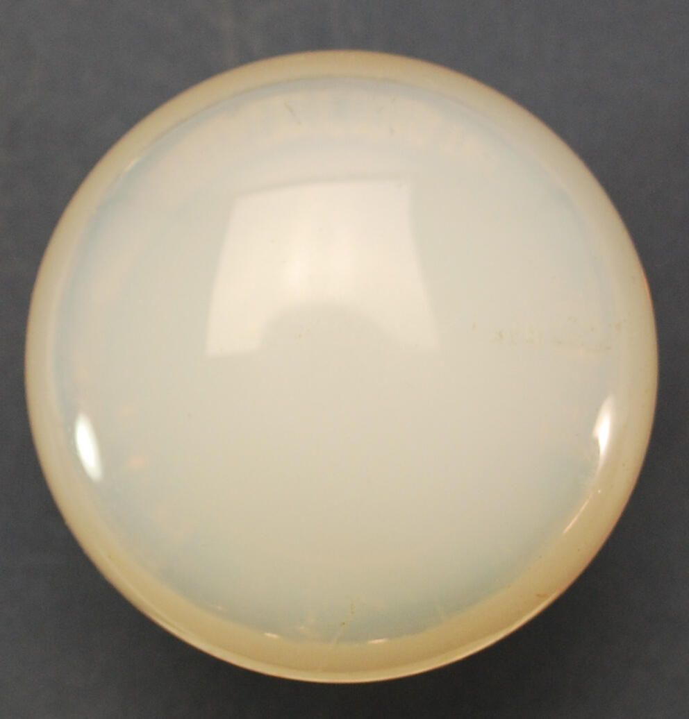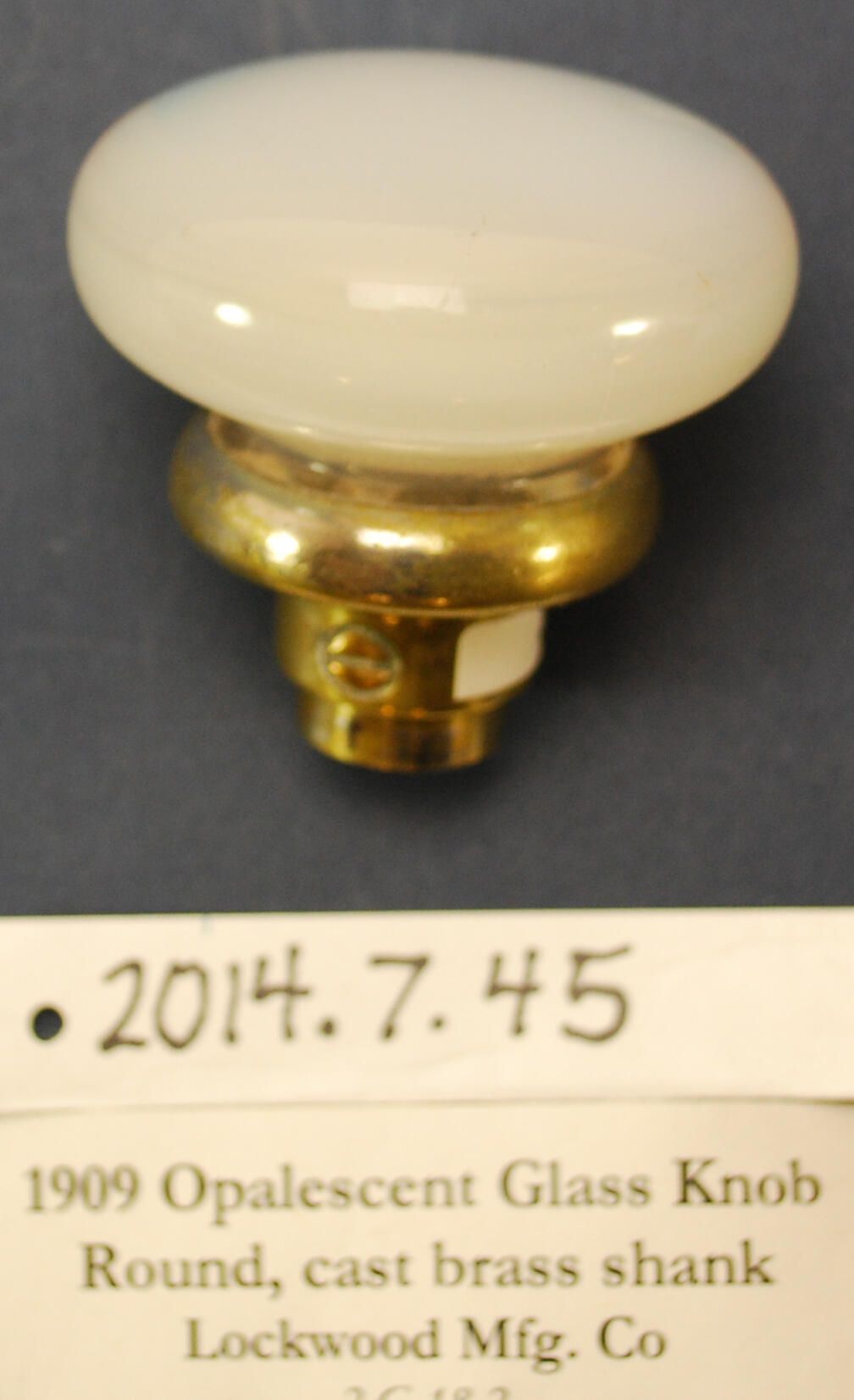Design Name: Manufacturer: Attrib to Lockwood Mfg. Co. Style: Material: Opalescent Glass / Brass Manufacturing Method: Pressed Surface Finish: Traces of plating, nickel VDA Classification: Glass VDA Number: Z Shape: Domed Patent Specifics: Lock Type (If Applicable): Inscription/Makers Mark: Inscription Text: Comments: Semi-translucent opalescent glass.