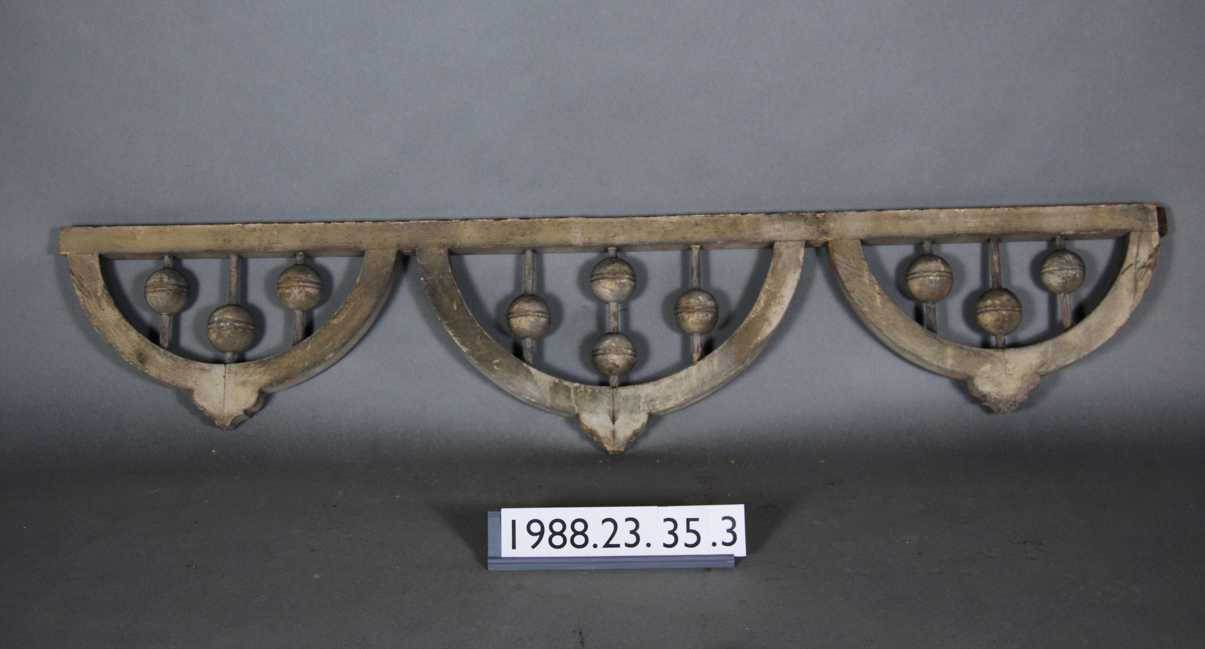 Exterior wood spindle work composed of top and bottom rail and series of three semi-circular drops -- each with opening and series of three spindles mounted within openings. Painted beige / pink.