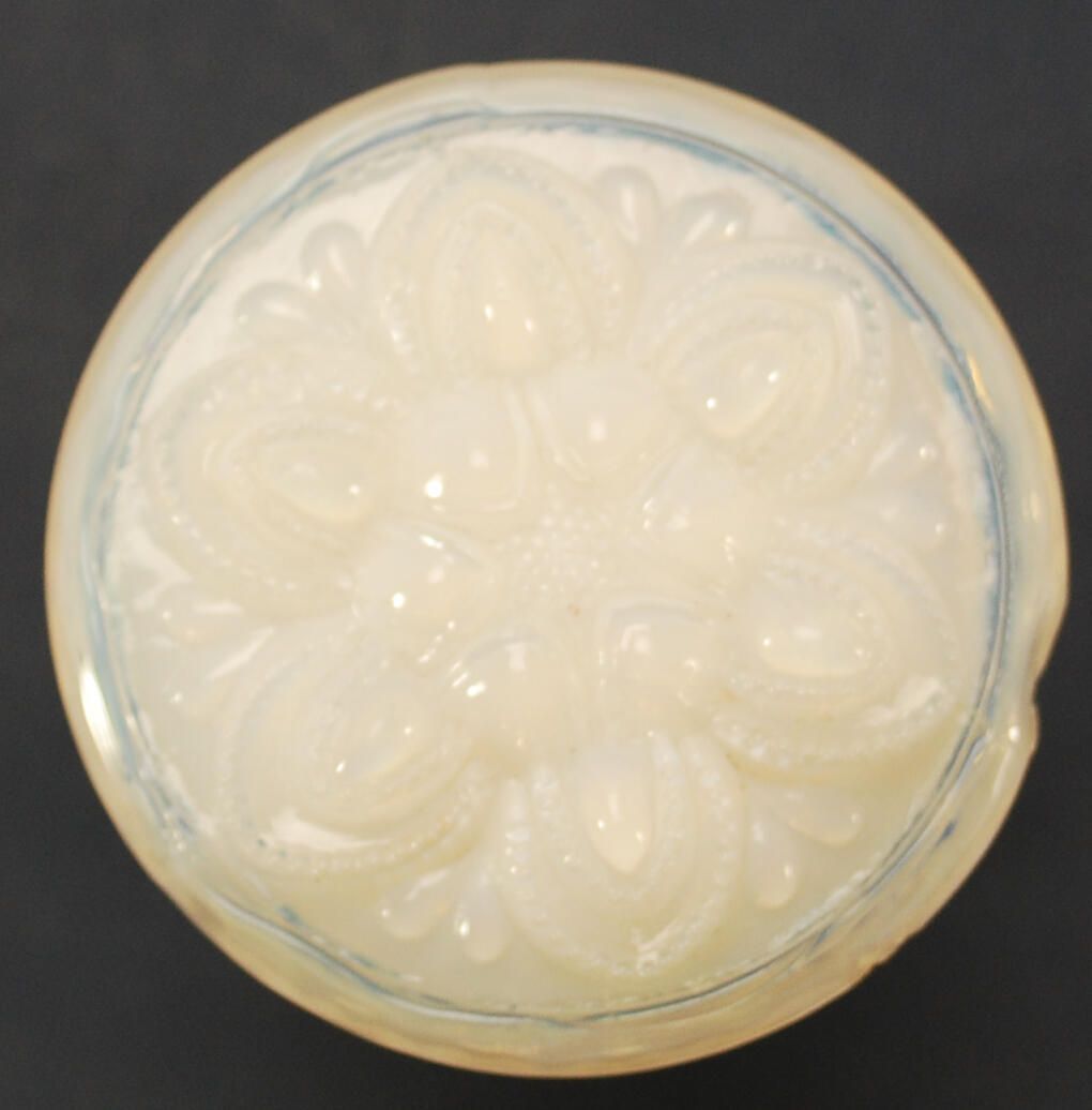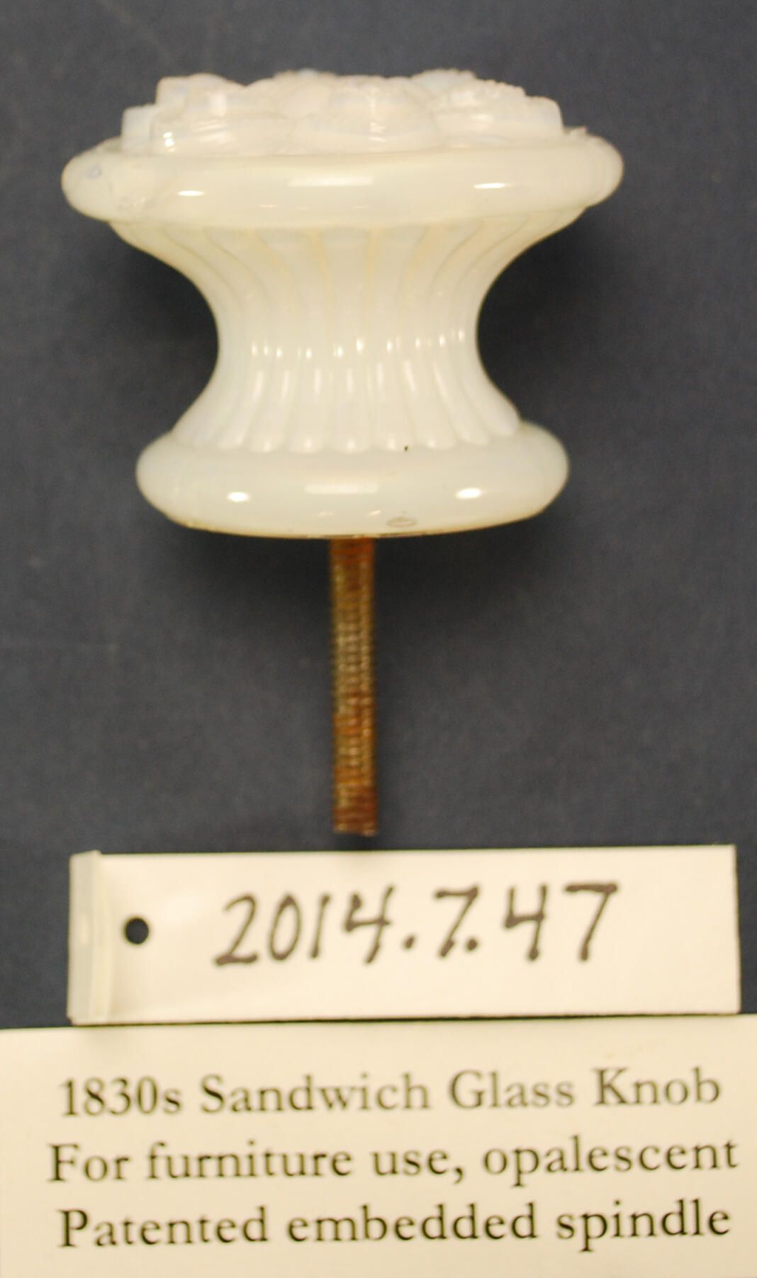Comments: Semi-translucent opalescent glass furniture knob. Chipped edge.
