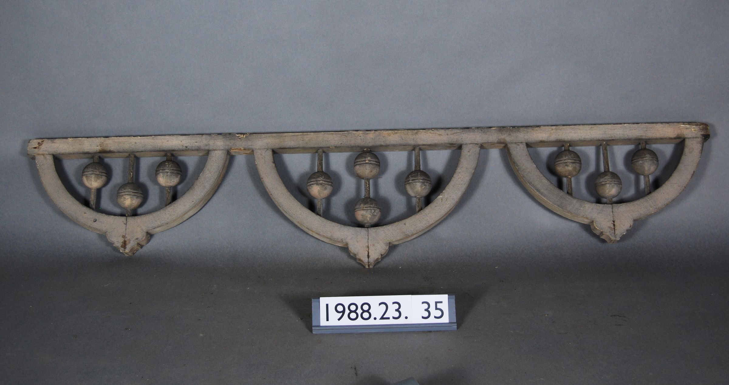 Exterior wood spindle work composed of top rail and series of three semi-circular drops -- each with opening and series of three spindles mounted within openings. Painted beige / pink. Manufacturer: Place of Manufacturer: Design motif: Style: Finish: Painted