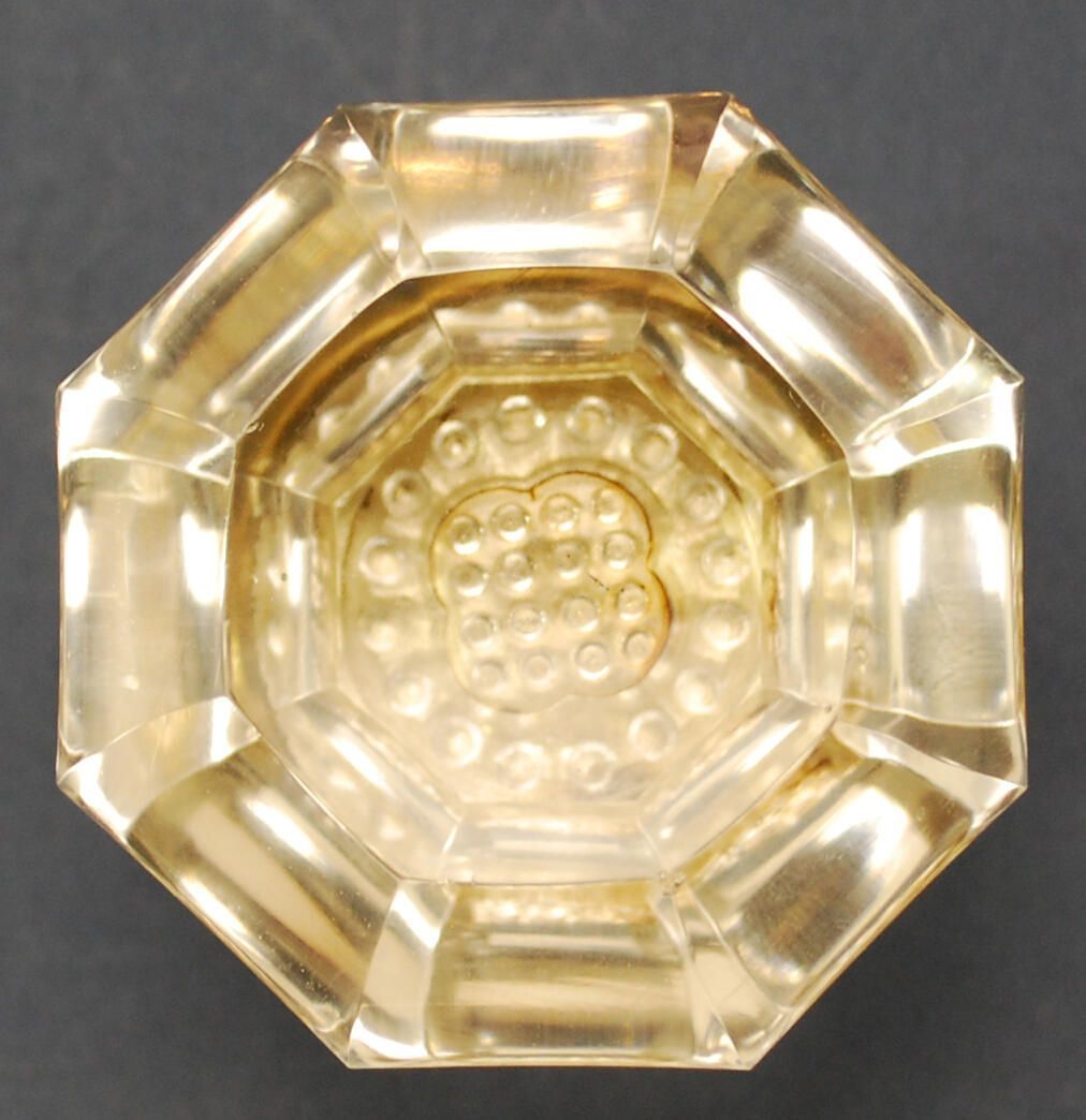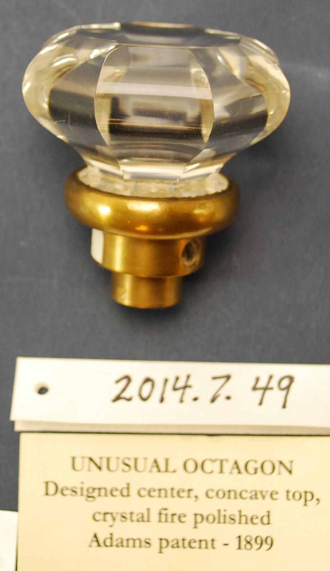 Design Name: Manufacturer: Attrib to Reading Knob Works Style: Material: Glass / Brass Manufacturing Method: Pressed / Ground & Polished Surface Finish: VDA Classification: Glass VDA Number: Z Shape: Octagonal Patent Specifics: 1899 Adams Patent Lock Type (If Applicable): Inscription/Makers Mark: Inscription Text: Comments: Clear pressed glass, ground face, fire polished.