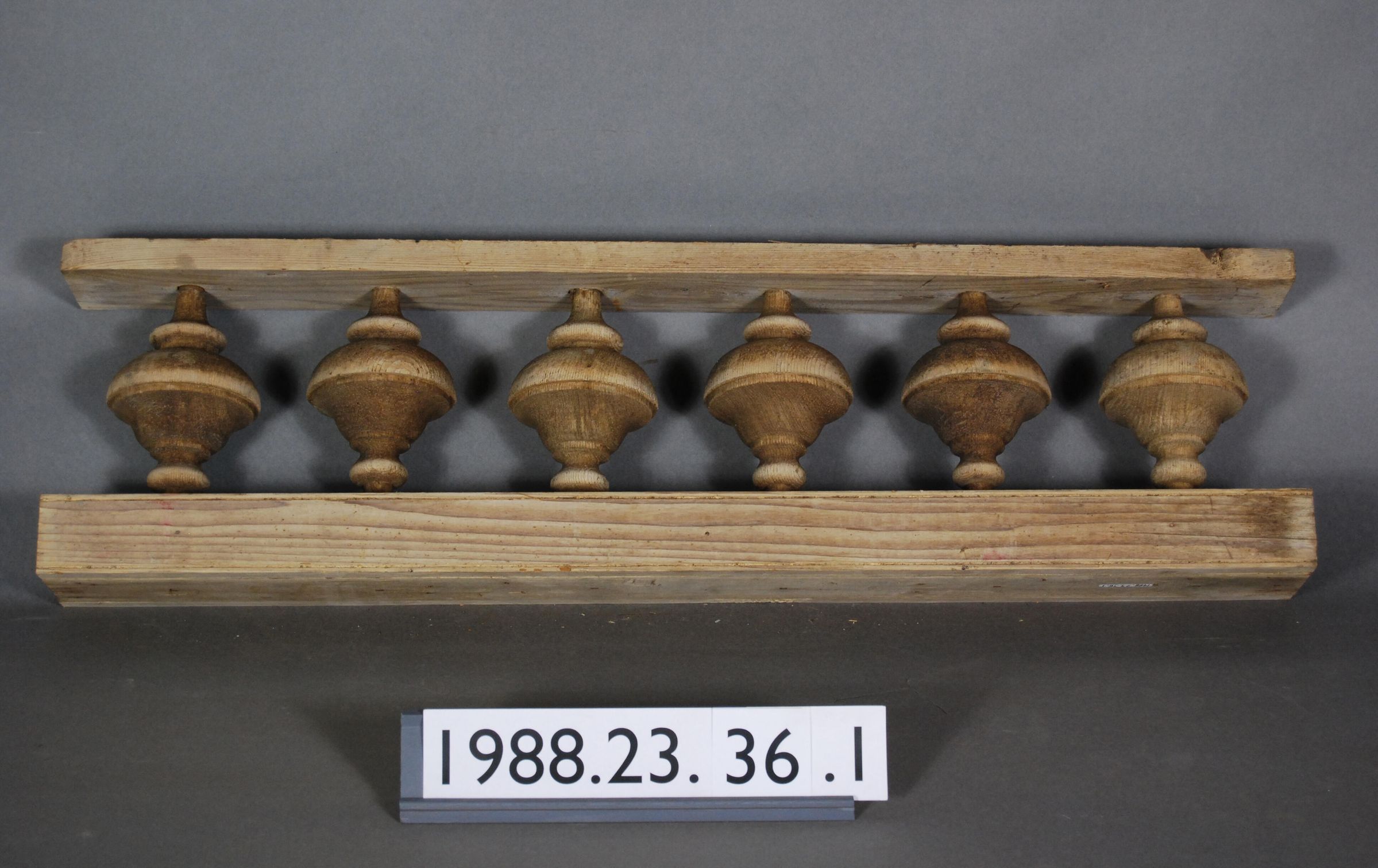 Exterior wood spindle work composed of top and bottom rails and eight turned spindles mounted between rails. Stripped of paint. Manufacturer: Place of Manufacturer: Design motif: Style: Finish: Stripped