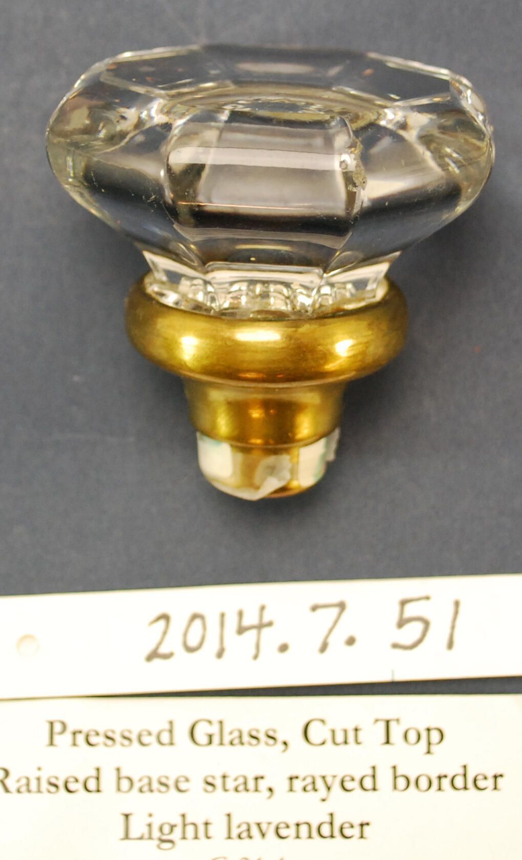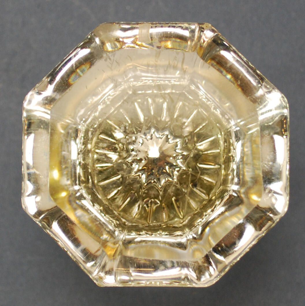 Design Name: Manufacturer: Unknown Style: Material: Glass / Brass Manufacturing Method: Pressed / NP Polished Surface Finish: VDA Classification: Glass VDA Number: Z Shape: Octagonal Patent Specifics: Lock Type (If Applicable): Inscription/Makers Mark: Inscription Text: Comments: Clear translucent glass, slight lavender tint to glass.