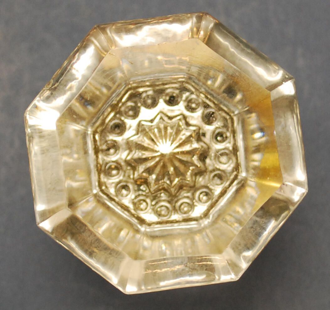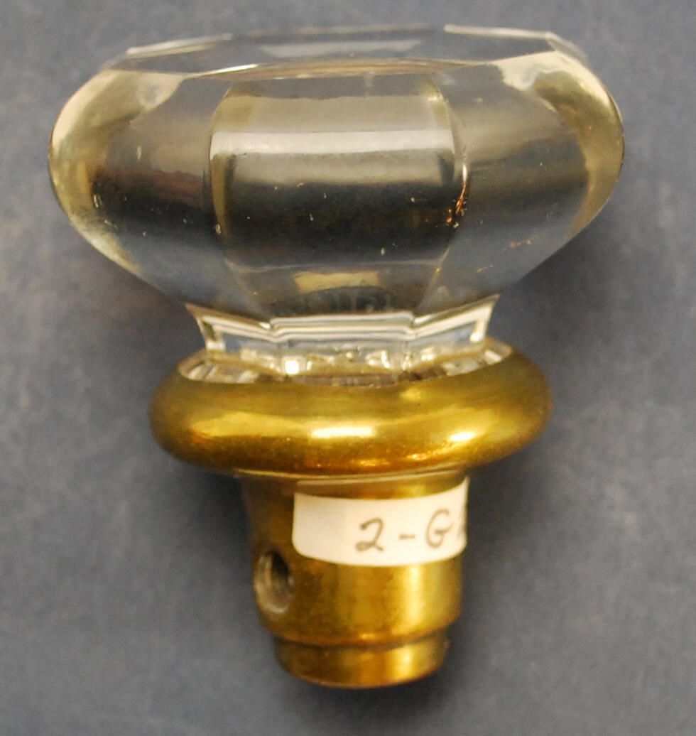 Design Name: Manufacturer: Attrib to Lockwood Mfg. Co. or Reading Knob Works Style: Material: Glass / Brass Manufacturing Method: Pressed / Polished Face Surface Finish: VDA Classification: Glass VDA Number: Z Shape: Octagonal Patent Specifics: Lock Type (If Applicable): Inscription/Makers Mark: Inscription Text: Comments: Clear translucent glass.