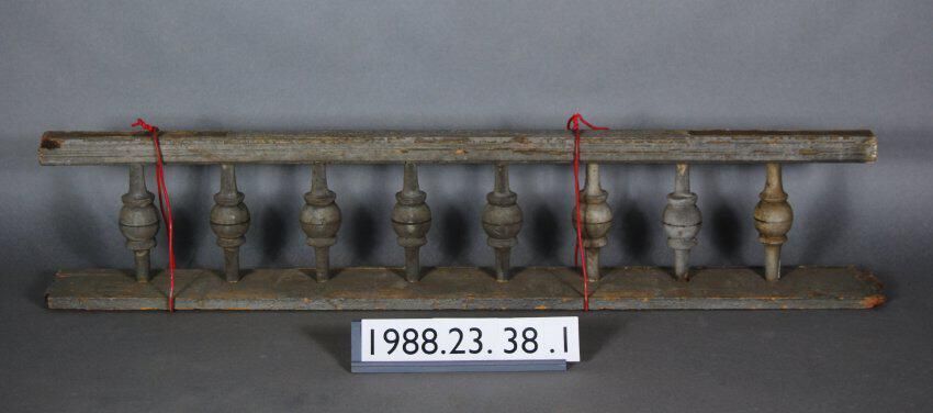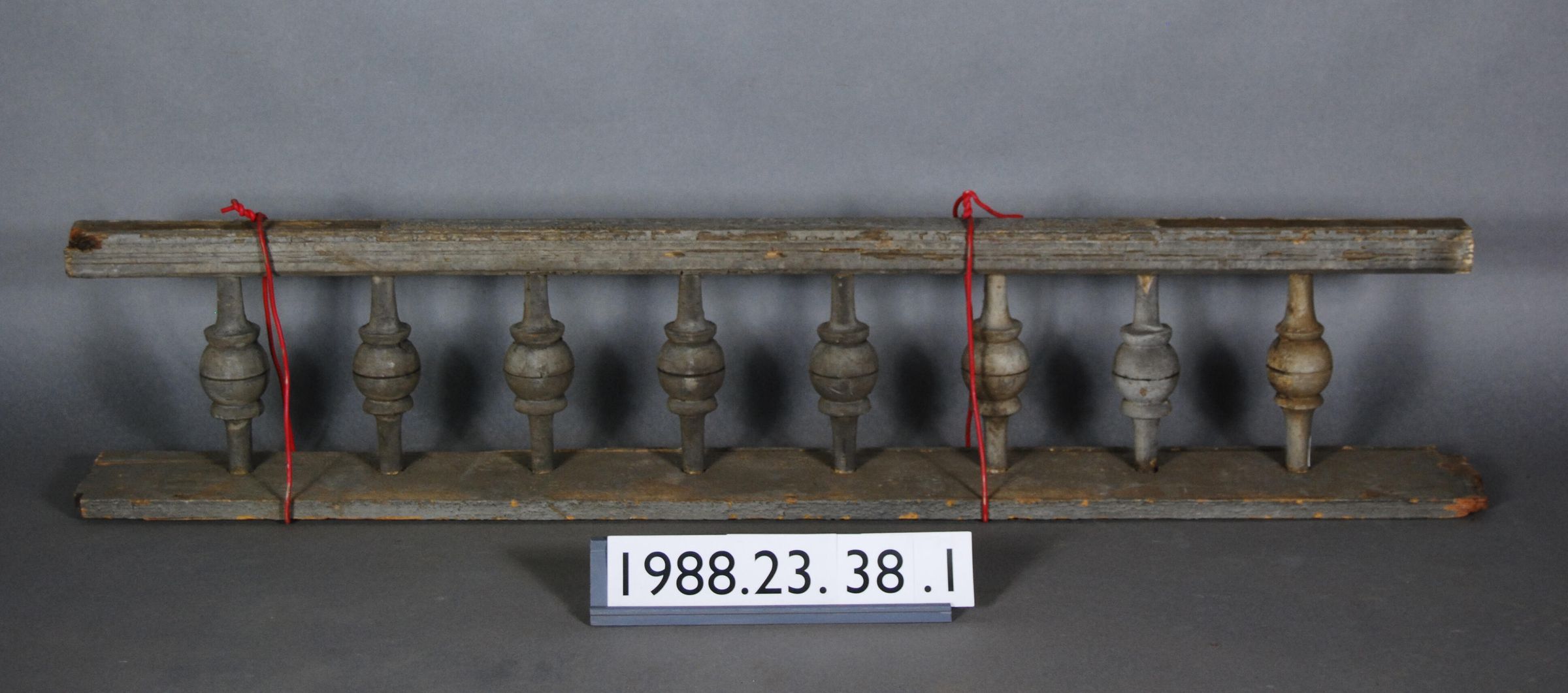 Exterior wood spindle work composed of top and bottom rails and eight turned spindles mounted between rails. Painted grey. Manufacturer: Place of Manufacturer: Design motif: Style: Finish: Painted