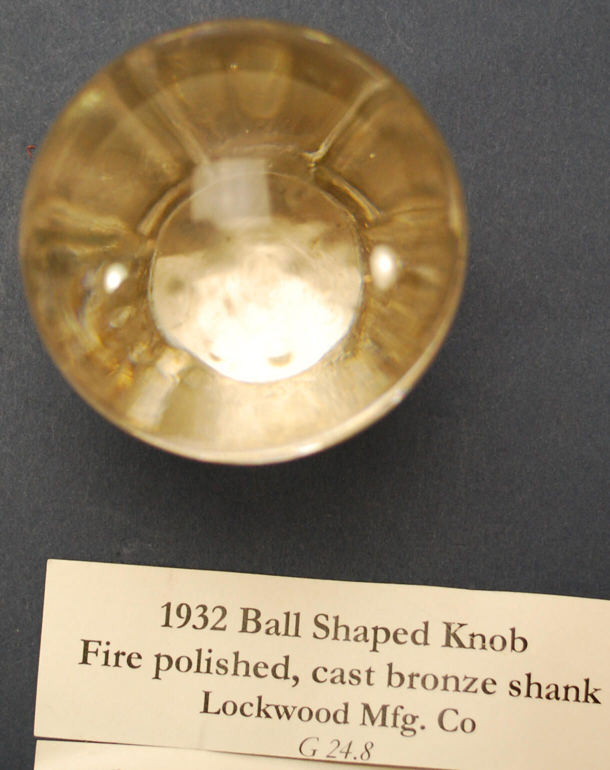 Design Name: Manufacturer: Attrib to Lockwood Mfg. Co. Style: Material: Glass / Bronze Manufacturing Method: Cast Surface Finish: Fire Polished VDA Classification: Glass VDA Number: Z Shape: Spherical Patent Specifics: Lock Type (If Applicable): Inscription/Makers Mark: Inscription Text: Comments: