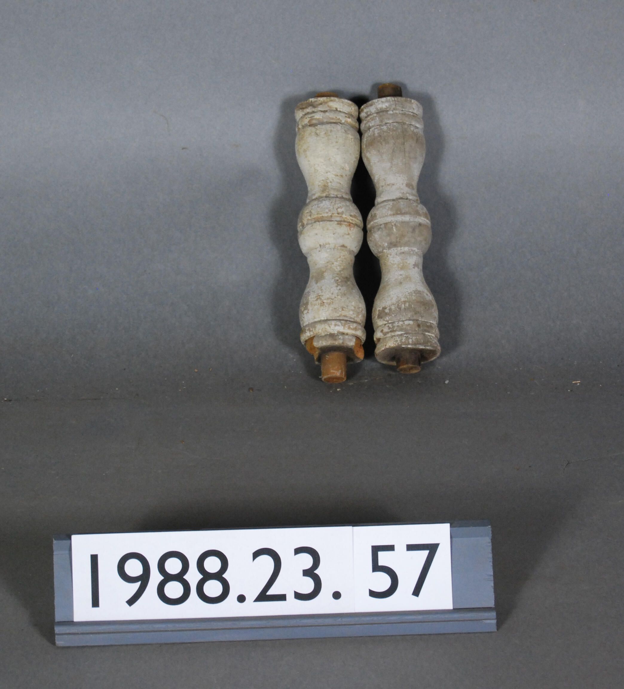 One lot of two exterior wood turned spindles. One end of each is cut at an angle. Manufacturer: Place of Manufacturer: Design motif: Style: Finish: Painted