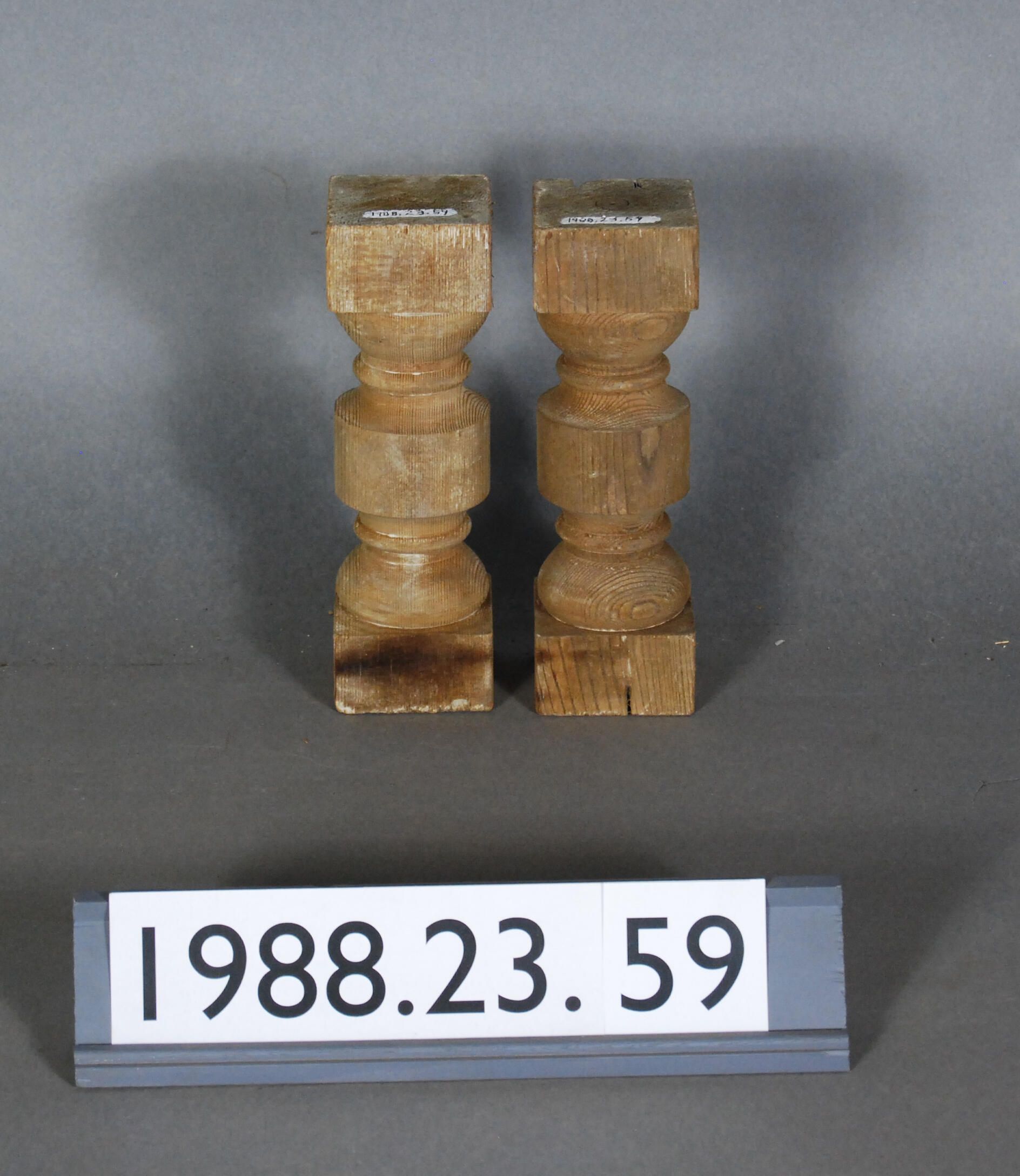 One lot of two exterior wood turned spindles. Stripped of paint. Manufacturer: Place of Manufacturer: Design motif: Style: Finish: Stripped
