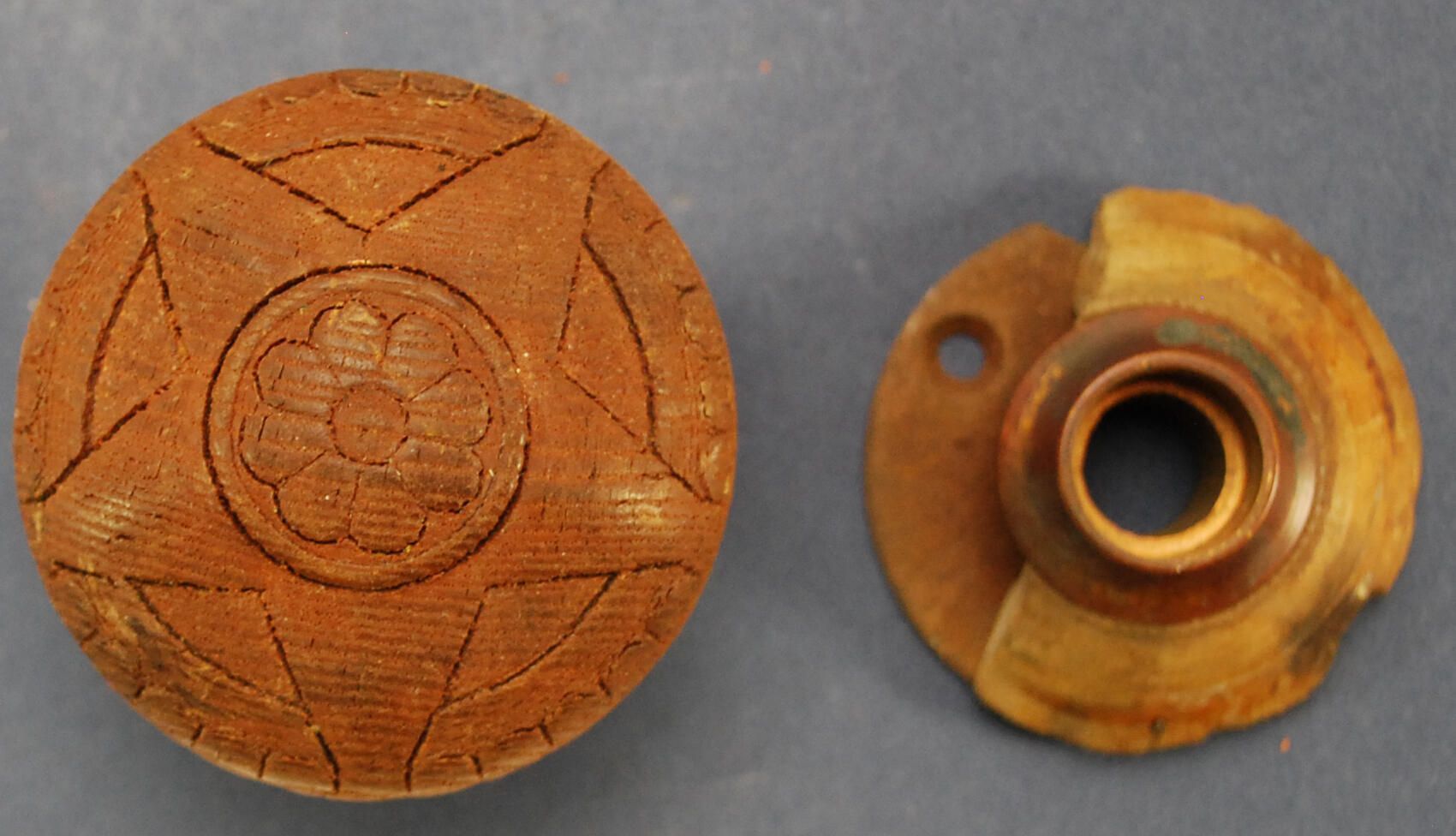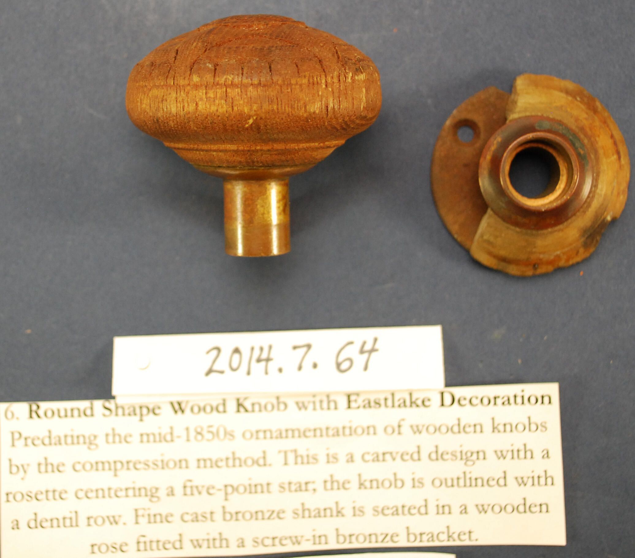 Comments: Turned knob with machine carved star motif, has bronze and wood rose, piece of rose missing.Lexicon