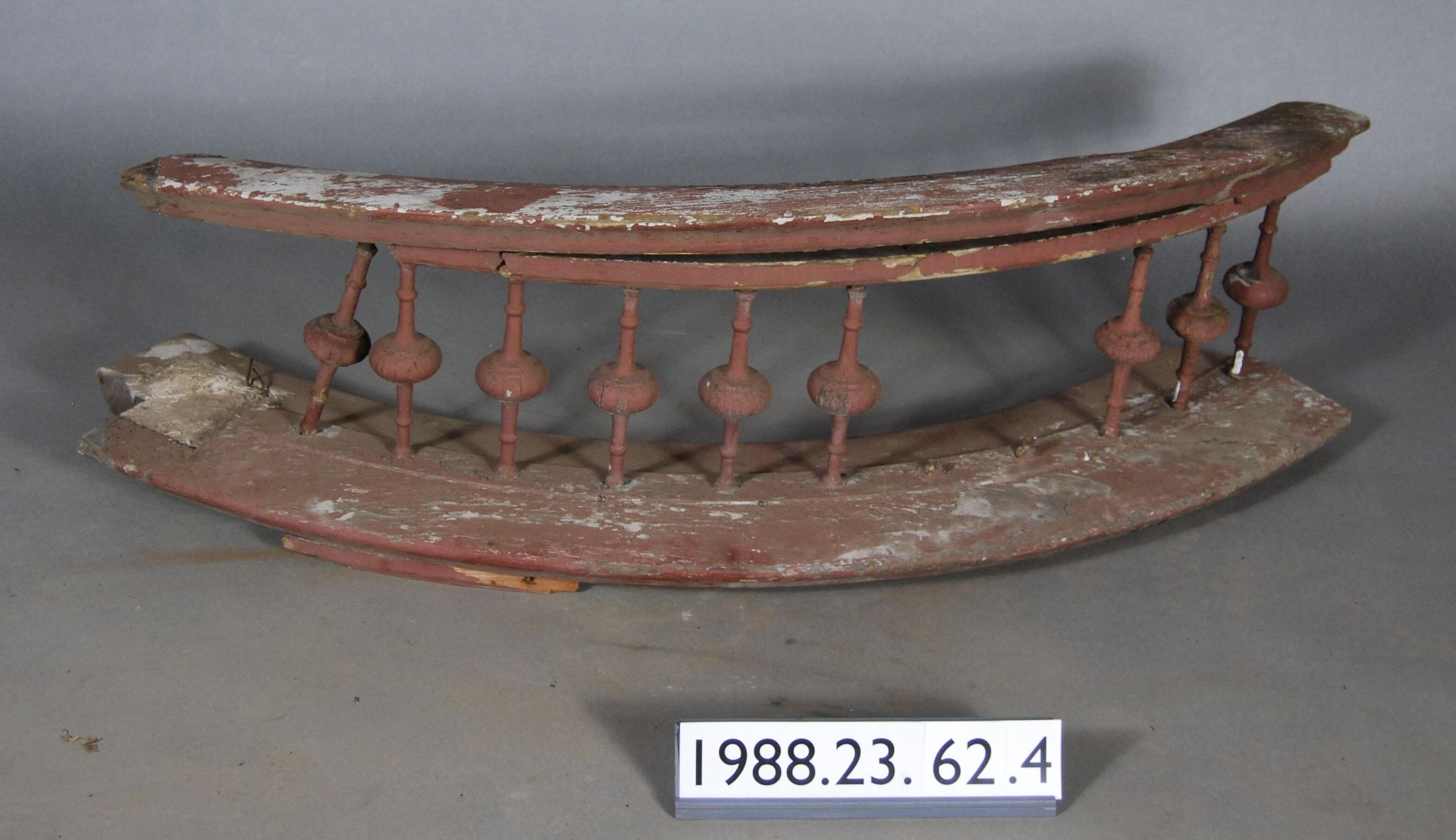 Exterior wood spindle work composed of curved top rail (broken into four detached fragments). Nine turned spindles (originally) had eleven) and curved bottom rail. One end of lower rail has shallow mortice pocket to fit column. Painted dark reddish brown. Part of porch assembly.