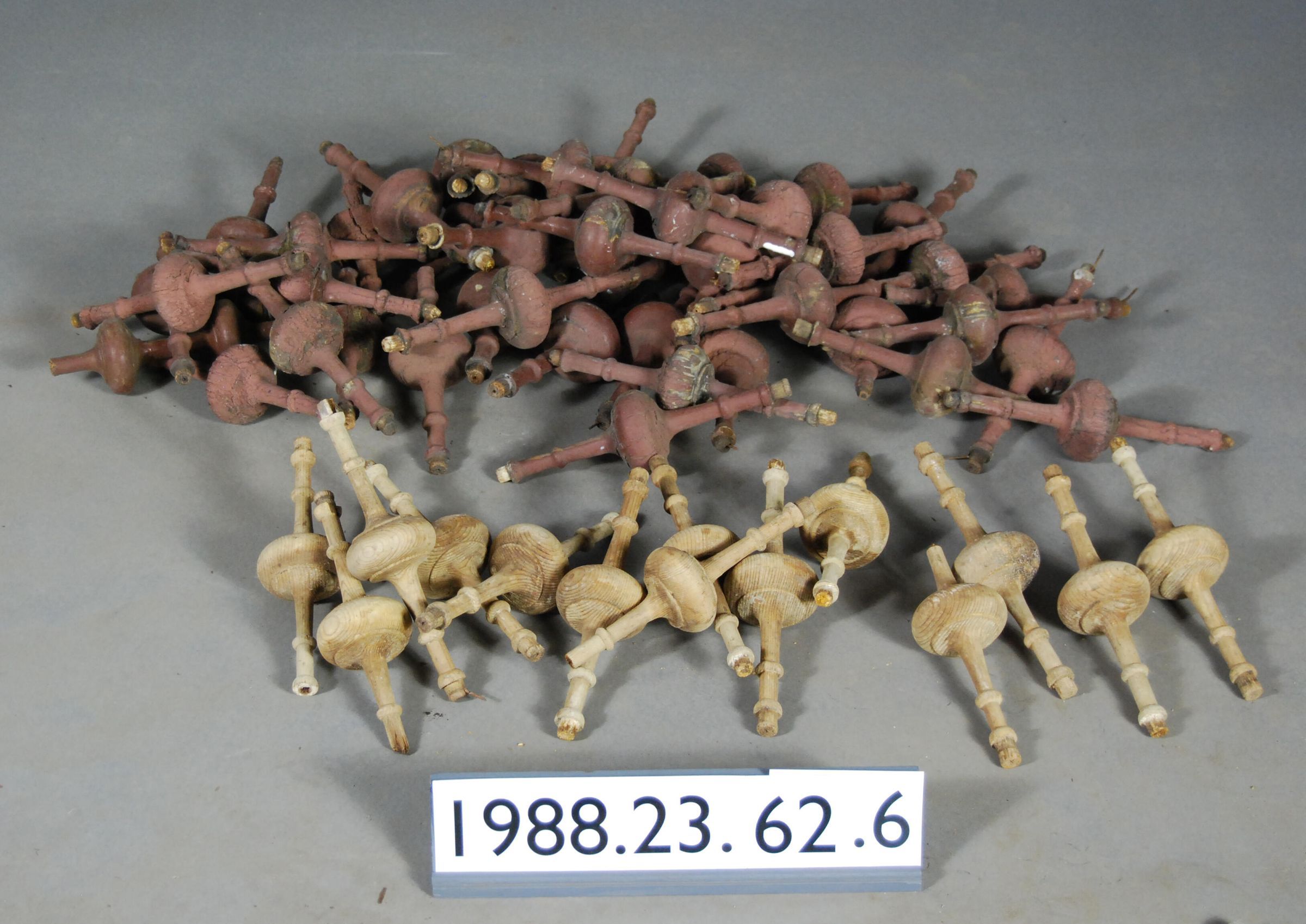 One lot of sixty-three exterior wood turned spindles. Of the total, forty-eight are painted -- of these five are truncated or damaged. The remainder are stripped -- four of which are truncated. One painted spindle has dual semi-spherical knops. Part of porch assembly.