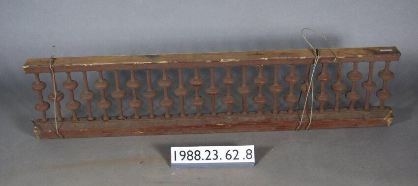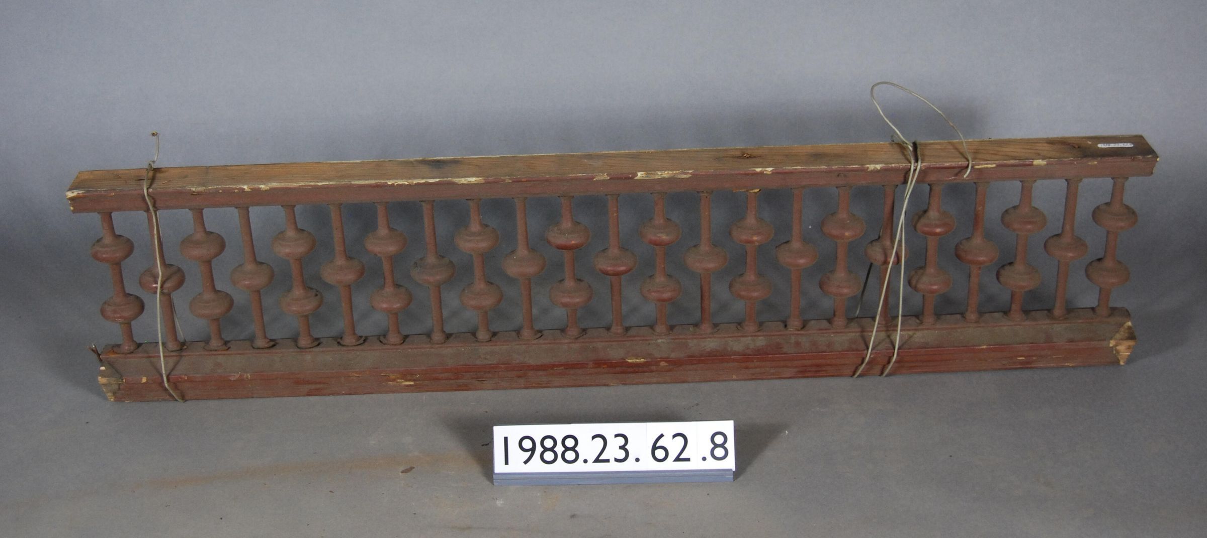 Exterior wood spindle work composed of top and bottom rails and twenty-three turned spindles. Painted dark reddish brown. Part of porch assembly. Manufacturer: Place of Manufacturer: Design motif: Style: Finish: Painted
