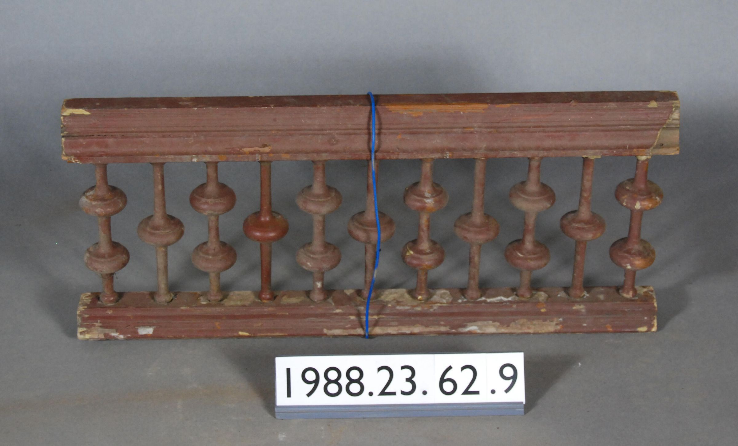 Exterior wood spindle work composed of top and bottom rails and eleven turned spindles. Painted dark reddish brown. Part of porch assembly. Manufacturer: Place of Manufacturer: Design motif: Style: Finish: Painted