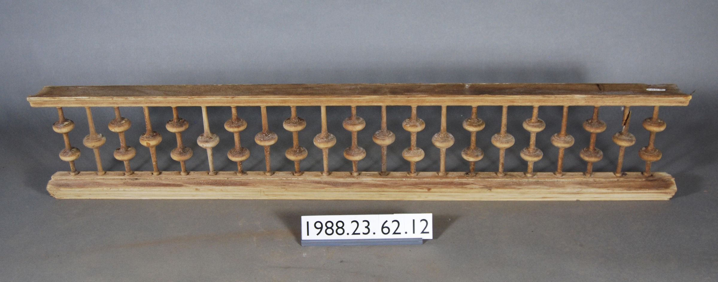 Exterior wood spindle work composed of curved top and bottom rails and twenty-one spindles (one spindle is broken). Originally painted - now stripped. Part of porch assembly. Manufacturer: Place of Manufacturer: Design motif: Style: Finish: Stripped